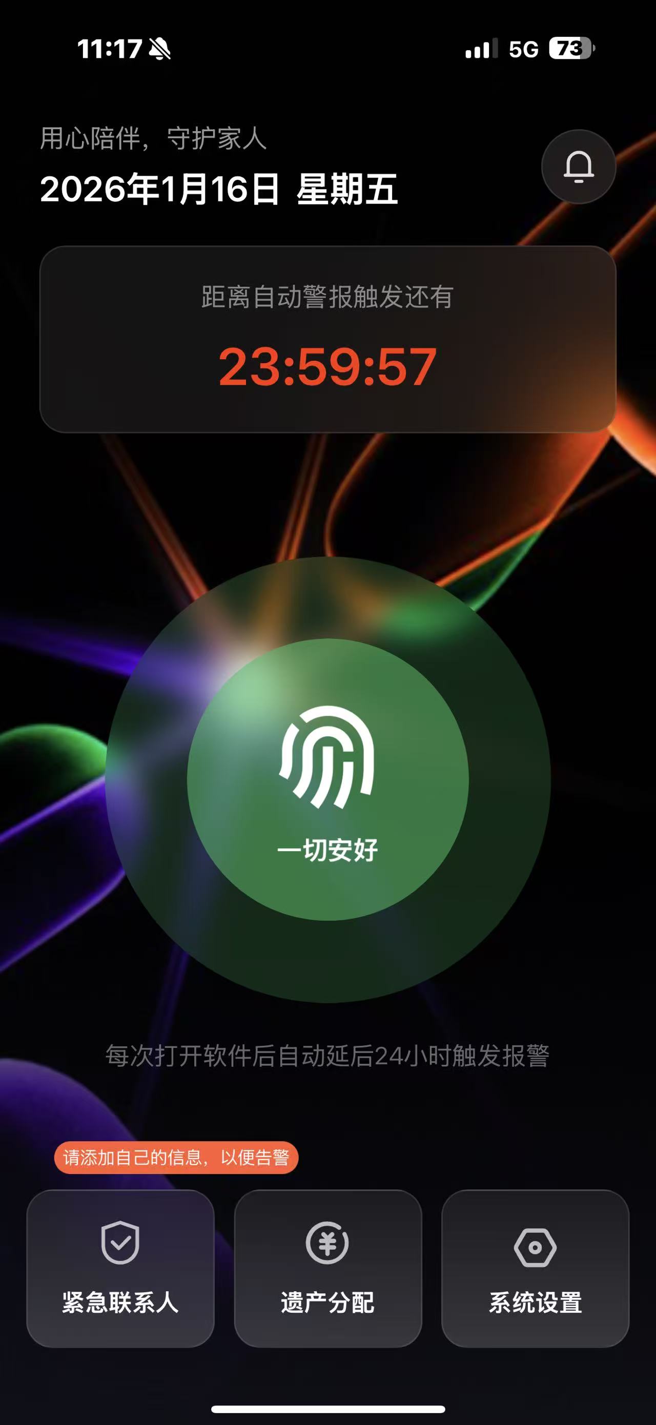 据介绍,该应用是为独居人群打造的轻量化安全工具,用户需要设置紧急联系人并签到,若连续多日没在应用内签到,系统将于次日自动发送邮件告知紧急联系人。