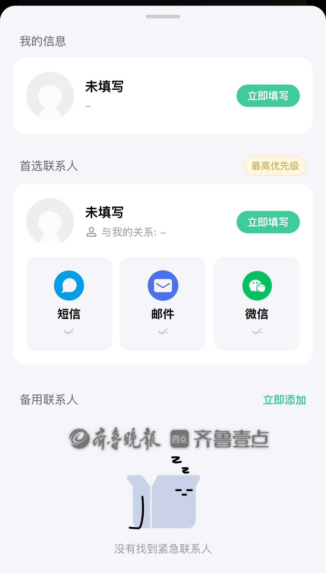 点击“紧急联系人”选项后,可以登记个人信息,还有首选联系人的信息,告知方式也从仅“邮件”通知,增加为“短信”“邮件”“微信”三项选择;