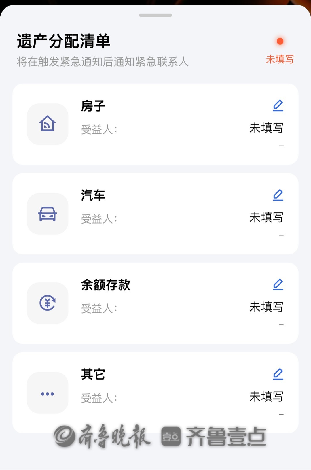 更新后的整个页面上,标注了日期,以及把签到的“指纹识别”功能放到了更佳显著的位置。页面下方也有三个选项,分别为“紧急联系人”“遗产分配”“系统设置”等。