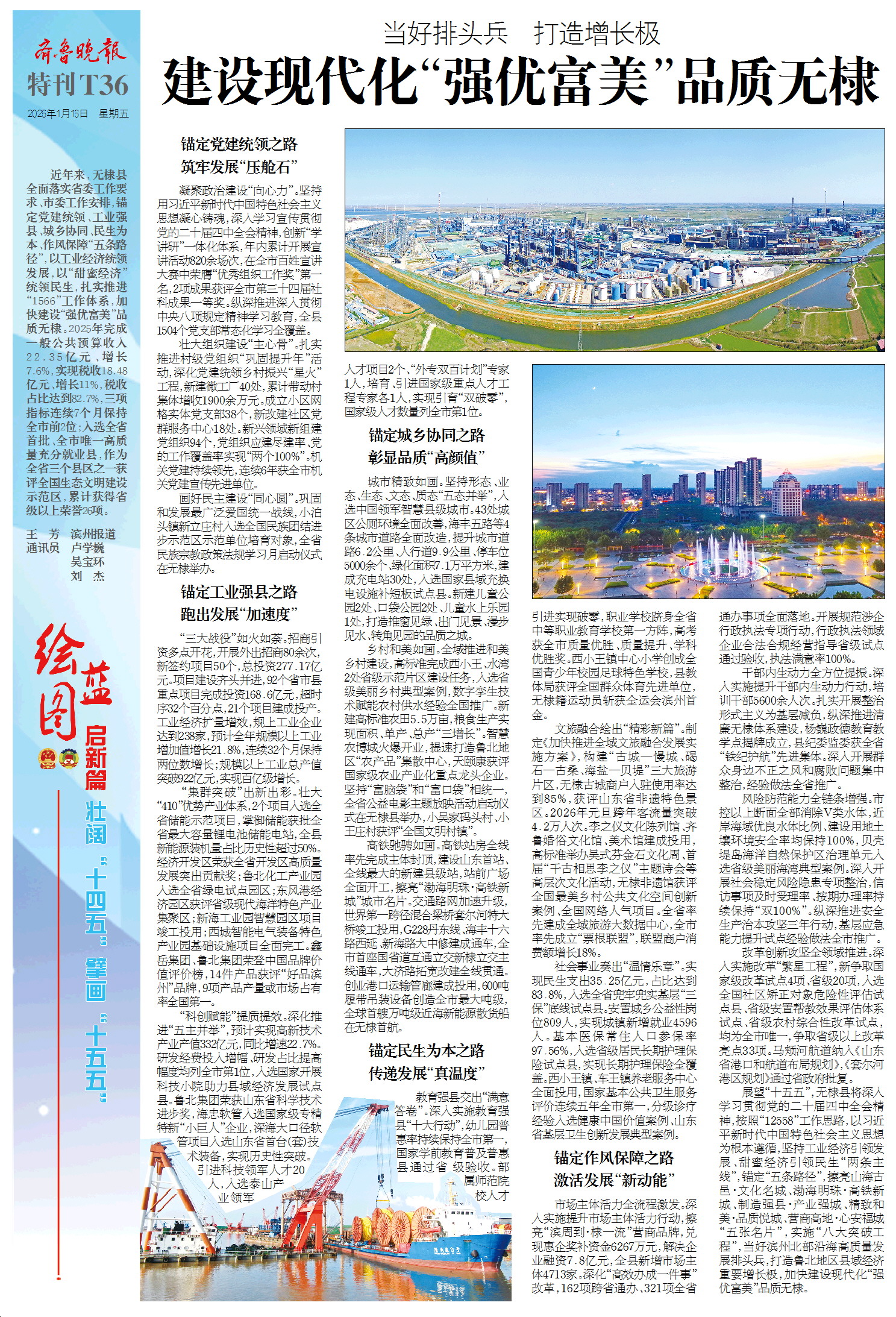 展望“十五五”,无棣县将深入学习贯彻党的二十届四中全会精神,按照“12558”工作思路,以习近平新时代中国特色社会主义思想为根本遵循,坚持工业经济引领发展、甜蜜经济引领民生“两条主线”,锚定“五条路径”,擦亮山海古邑·文化名城、渤海明珠·高铁新城、制造强县·产业强城、精致和美·品质悦城、营商高地·心安福城“五张名片”,实施“八大突破工程”,当好滨州北部沿海高质量发展排头兵,打造鲁北地区县域经济重要增长极,加快建设现代化“强优富美”品质无棣。