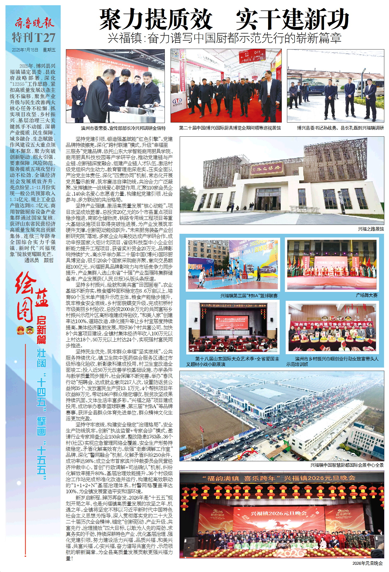 坚持产业强镇,激活高质量发展“核心动能”。项目攻坚成效显著。总投资20亿元的5个市县重点项目稳步推进,南部仓储物流、铁路专用线工程项目等重大基础设施项目取得突破性进展,为产业发展筑牢硬件支撑。创新驱动能级跃升。“未来厨房装备产业创新研究院”落地,多家企业与高校达成产学研合作,成功申报国家火炬计划项目、省级科技型中小企业创新能力提升工程项目,获省奖补资金20万元。品牌影响持续扩大。高水平举办第二十届中国(博兴)国际厨具博览会,吸引20余个国家采购商齐聚,意向交易额超100亿元,兴福厨具品牌影响力与市场竞争力同步提升,产业集群入选山东省“十强”产业型雁阵集群储备库,产业发展获《人民日报》头版头条报道。