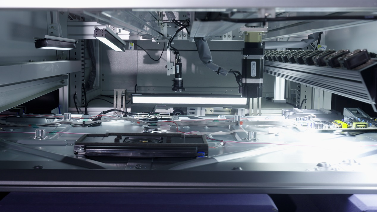 以通过机器人实现“面板自动精准卡合”这一行业首创技术为例,以往85吋大屏面板的精准装配需要5名工人手动对齐,不仅费力,还存在精度偏差和效率瓶颈。如今,这里搭载了行业首创的矩阵式面板精确卡合方案,通过多组高精度视觉相机为机器人赋能“眼睛”,搭配AI“大脑”实现自动撕膜、精准装配和实时校准的全流程自动化操作,它能实现0.1毫米级的精准定位,确保每次抓取和装配都毫厘不差。