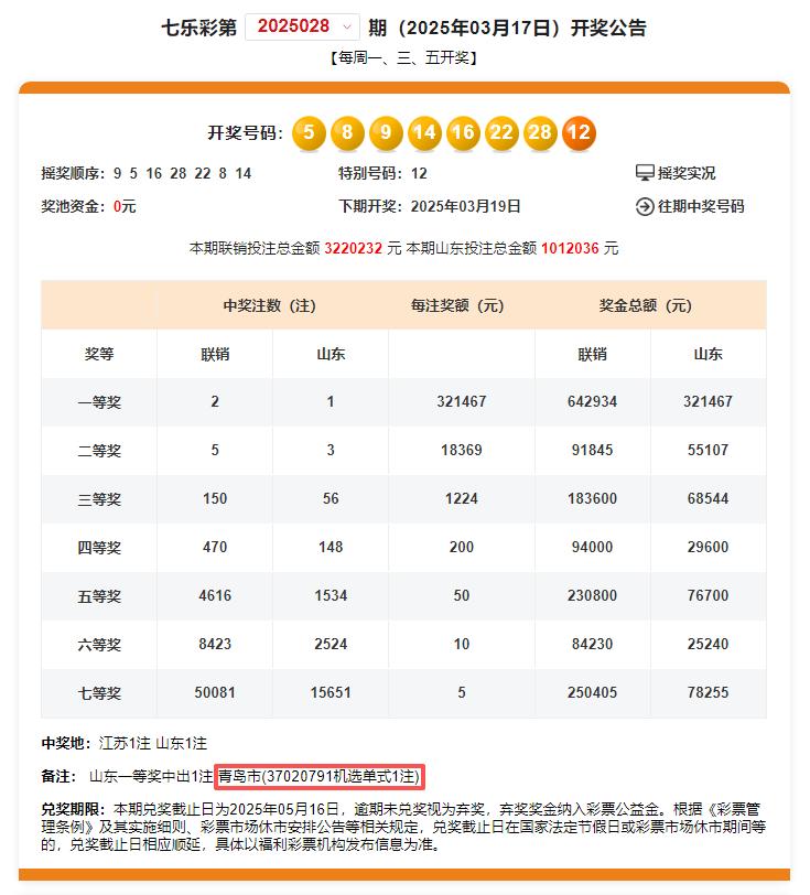 2025年3月17日晚的七乐彩第2025028开奖中,青岛喜中1注一等奖,单注奖金32万余元,花落城阳区前古镇社区456号的福彩37020791销售站。中奖彩票为一张七乐彩10元机选单式票,中得1注一等奖,单票奖金321467元。