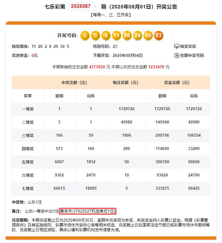 2025年8月1日晚的七乐彩第2025087期开奖中,青岛喜中全国唯一1注一等奖,单注奖金172万余元,花落李沧区四流中路47号的福彩37025527销售站,中奖彩票为一张七乐彩10元机选单式票,中得1注一等奖,单票奖金1729726元。