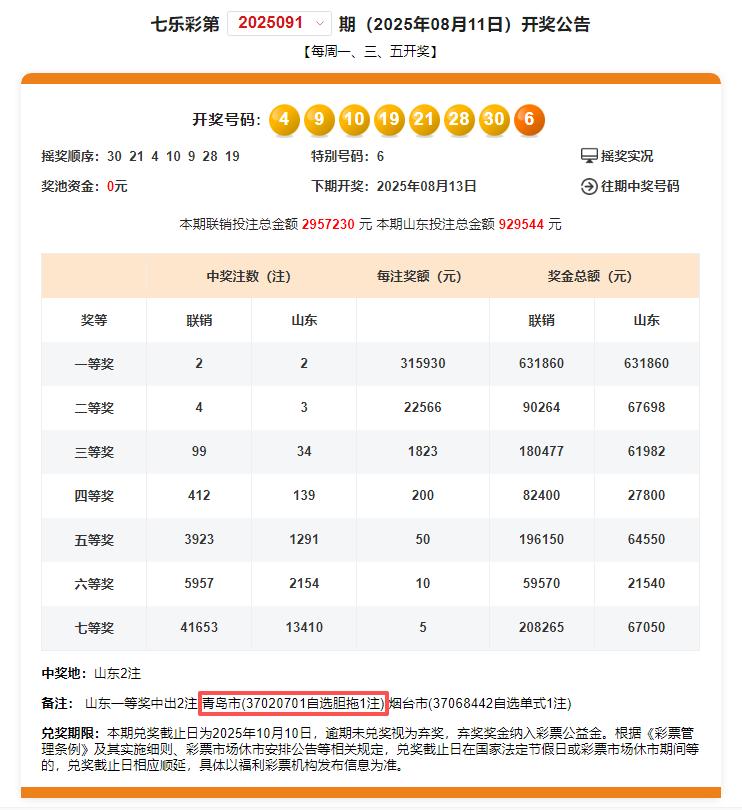 2025年9月12日的七乐彩第2025105期开奖中,青岛喜中全国唯一1注一等奖,单注奖金881991元,花落城阳高新区宝源路549号的福彩37023736销售站,中奖彩票为一张七乐彩10元自选单式票,中得1注一等奖,奖金881991元。