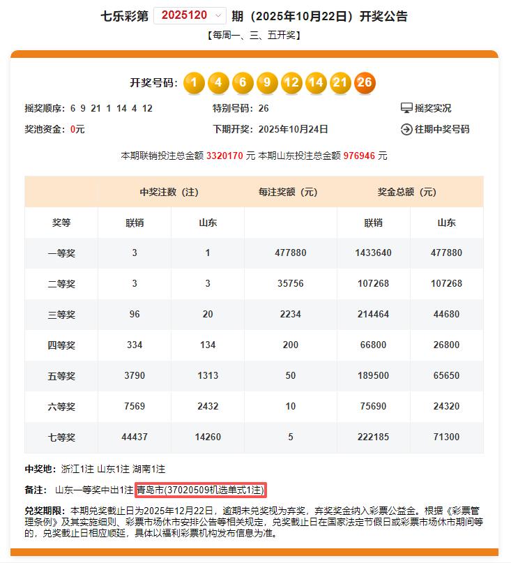 2025年10月22日晚的七乐彩第2025120期开奖中,青岛喜中1注头奖,单注奖金477880元。花落李沧区兴华路43号丁-2的福彩37020509销售站,中奖彩票为一张七乐彩10元机选单式票,共中得1注一等奖和1注七等奖,奖金合计477885元。