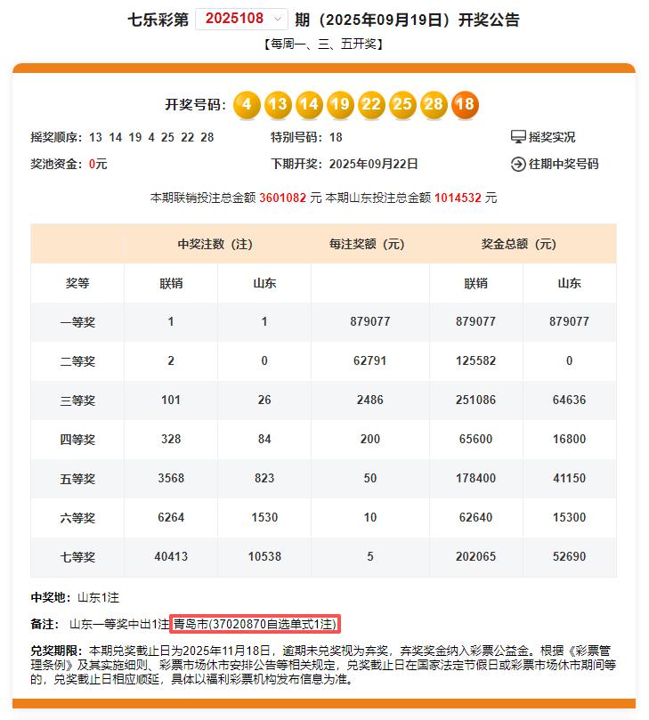2025年9月19日晚的七乐彩第2025108期开奖中,青岛再中全国唯一1注一等奖,单注奖金879077元,花落西海岸新区金桥大街150号网点的福彩37020870销售站,中奖彩票为一张七乐彩2元自选单式票,中得1注一等奖,奖金879077元。