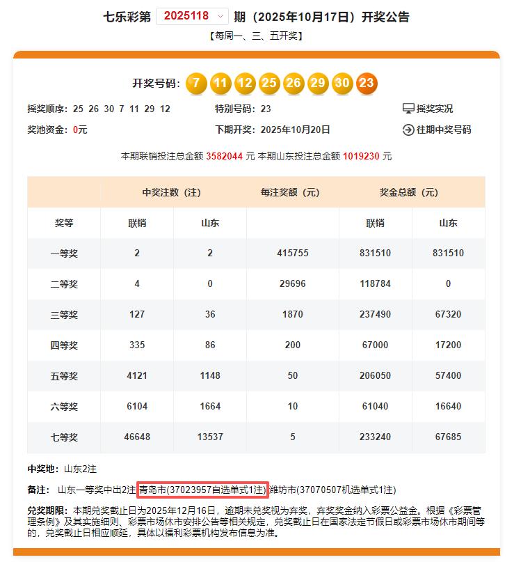 2025年10月17日晚的七乐彩第2025118期开奖,青岛喜中1注一等奖,单注奖金415755元,花落即墨区马山东路681号的福彩37023957销售站,中奖彩票为一张七乐彩10元自选单式票,中得1注一等奖和1注七等奖,奖金合计415760元。