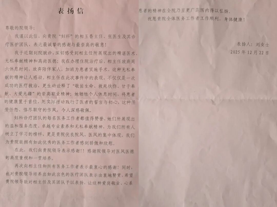 新年启新程,医者守初心。近日,青岛西海岸新区妇幼保健院妇科收到了一封饱含真情的表扬信和一面印有“医术精湛传四方 医德高尚暖人心”字样的锦旗,字字句句表达了对妇科全体医护人员的感激之情。