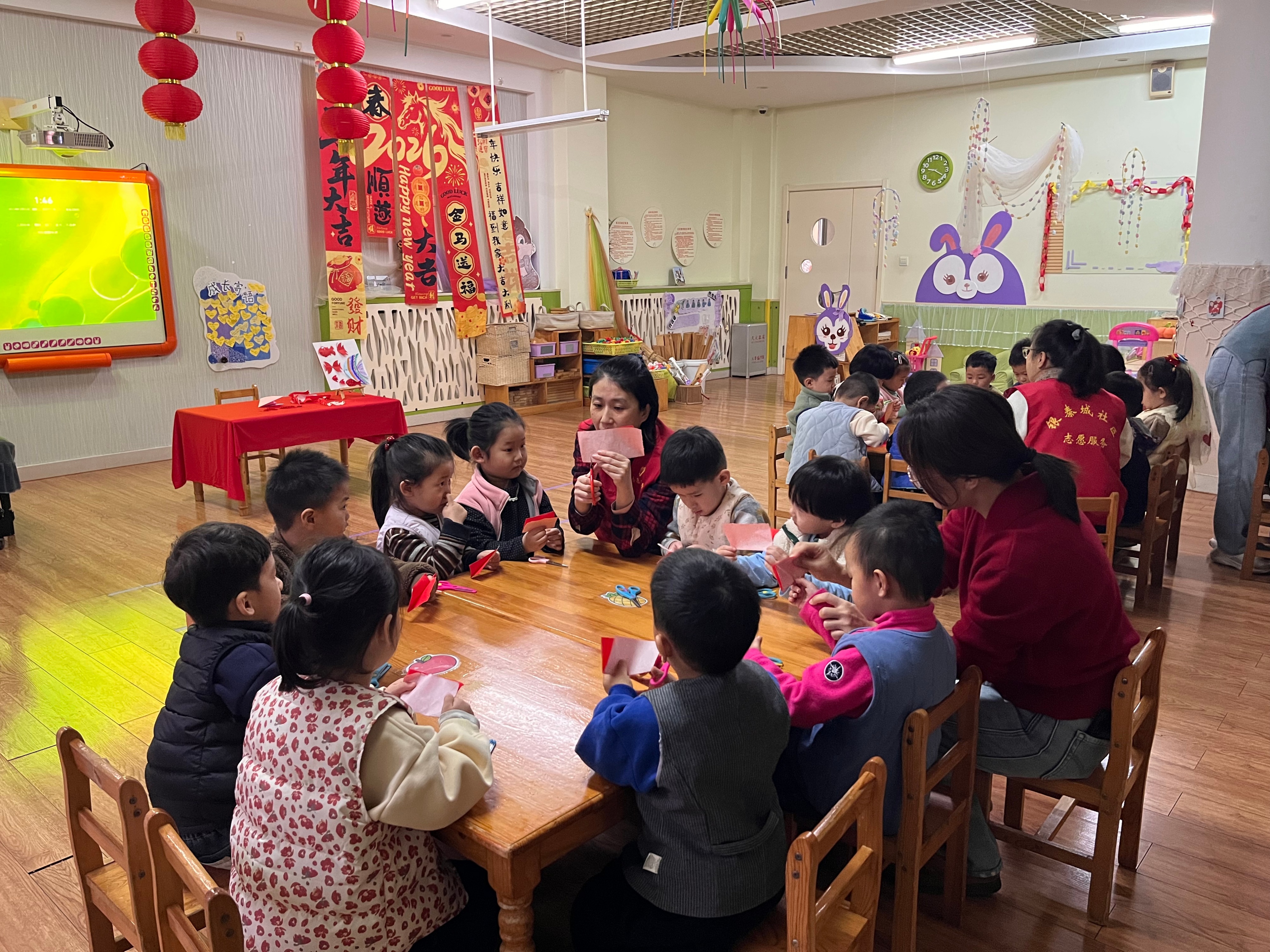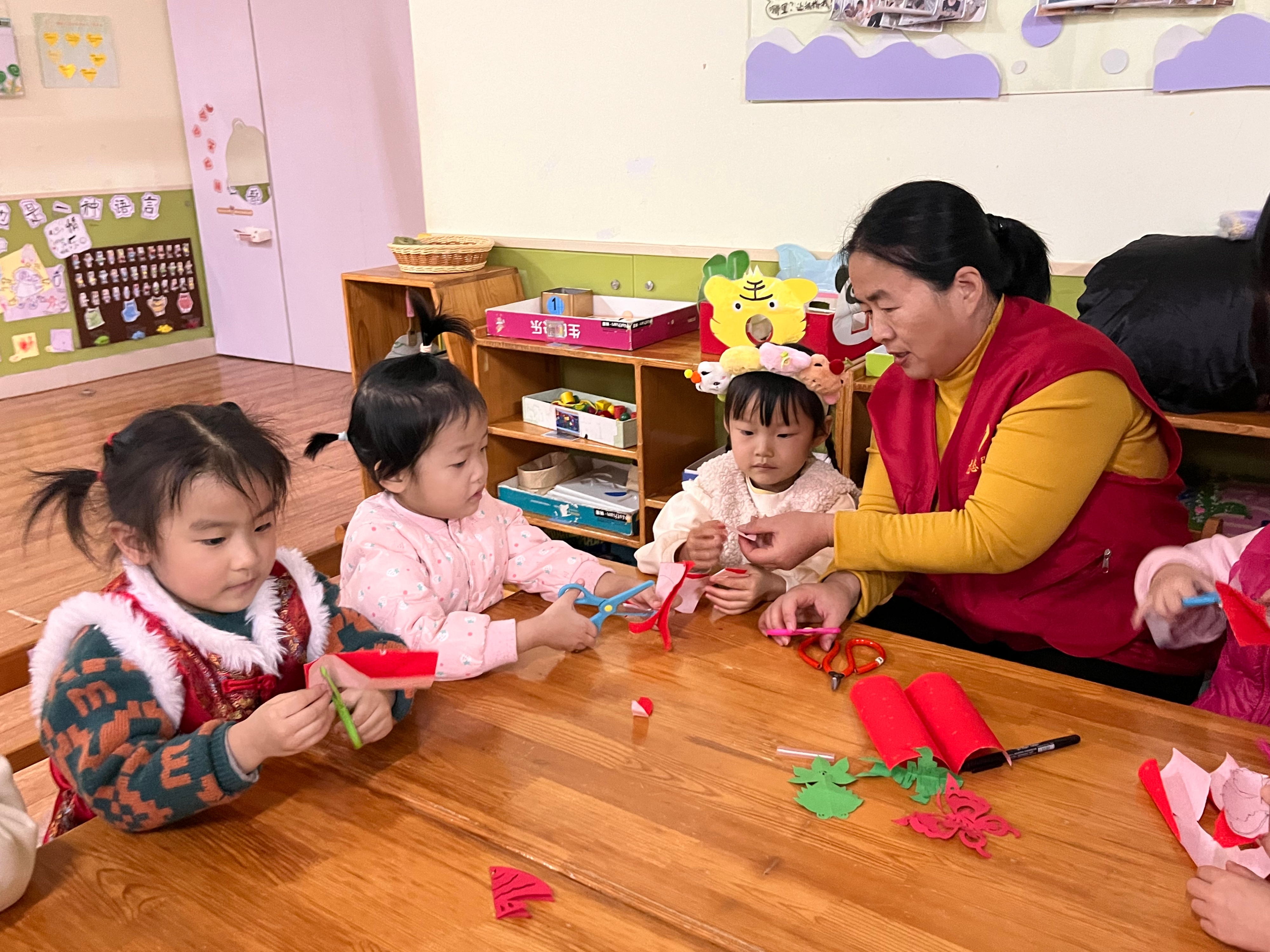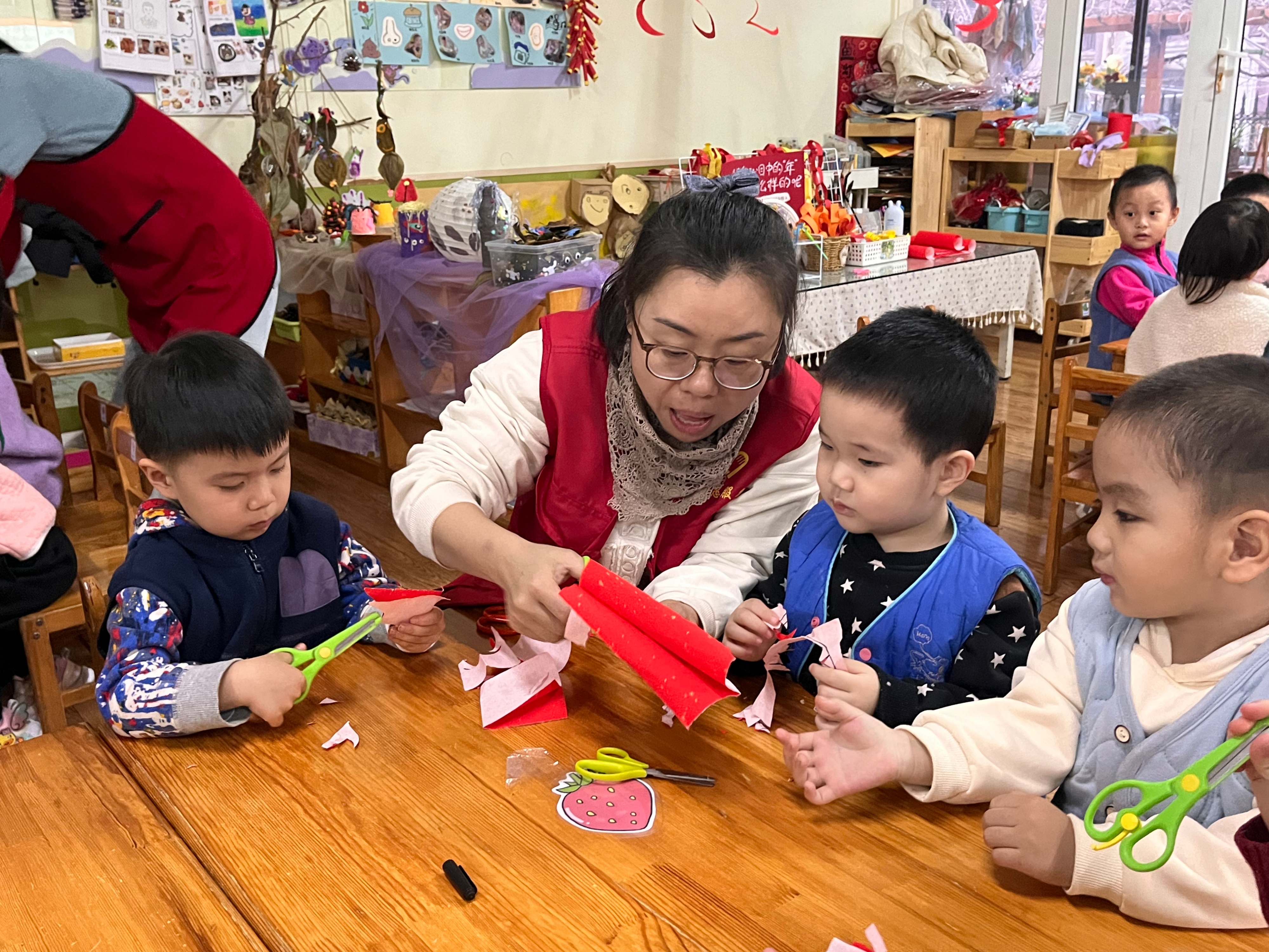 幼儿园的孩子们被分成3组,每组都配备了一名手艺人和一名老师。在手艺人和老师的指导下,孩子们开始了“年年有余”剪纸的实操。