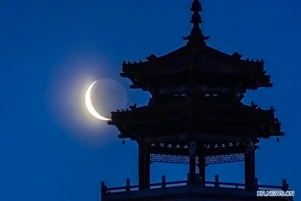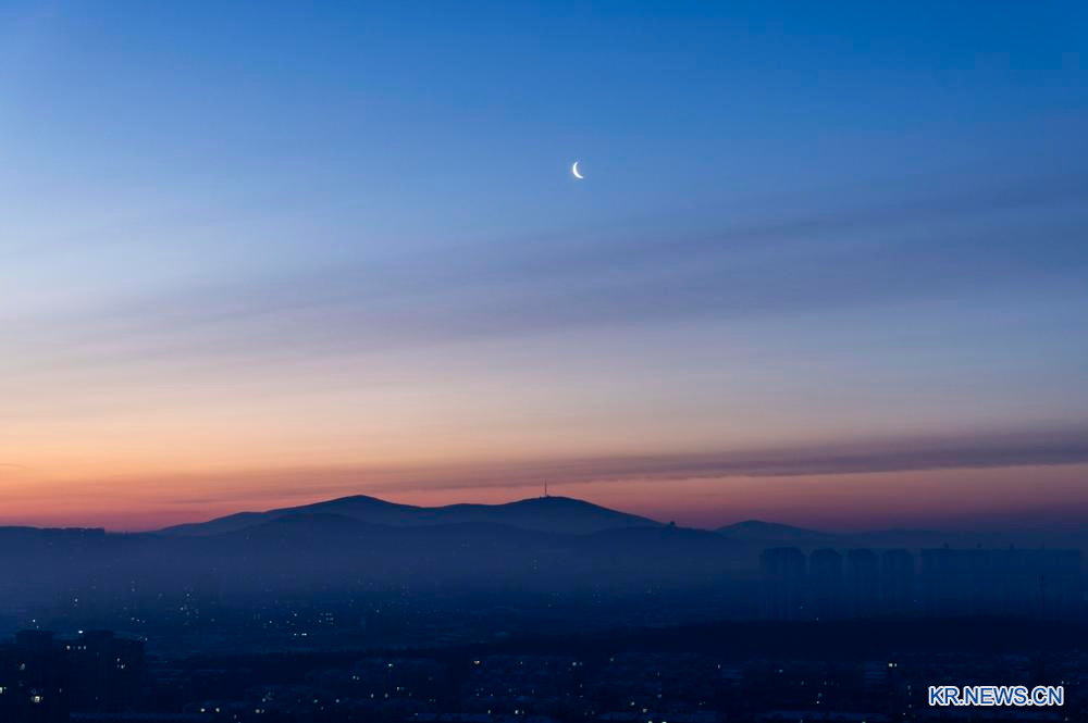 [신화망 중국 하얼빈 1월15일] 15일 헤이룽장(黑龍江)성 치치하얼(齊齊哈爾)시에서 포착한 그믐달.