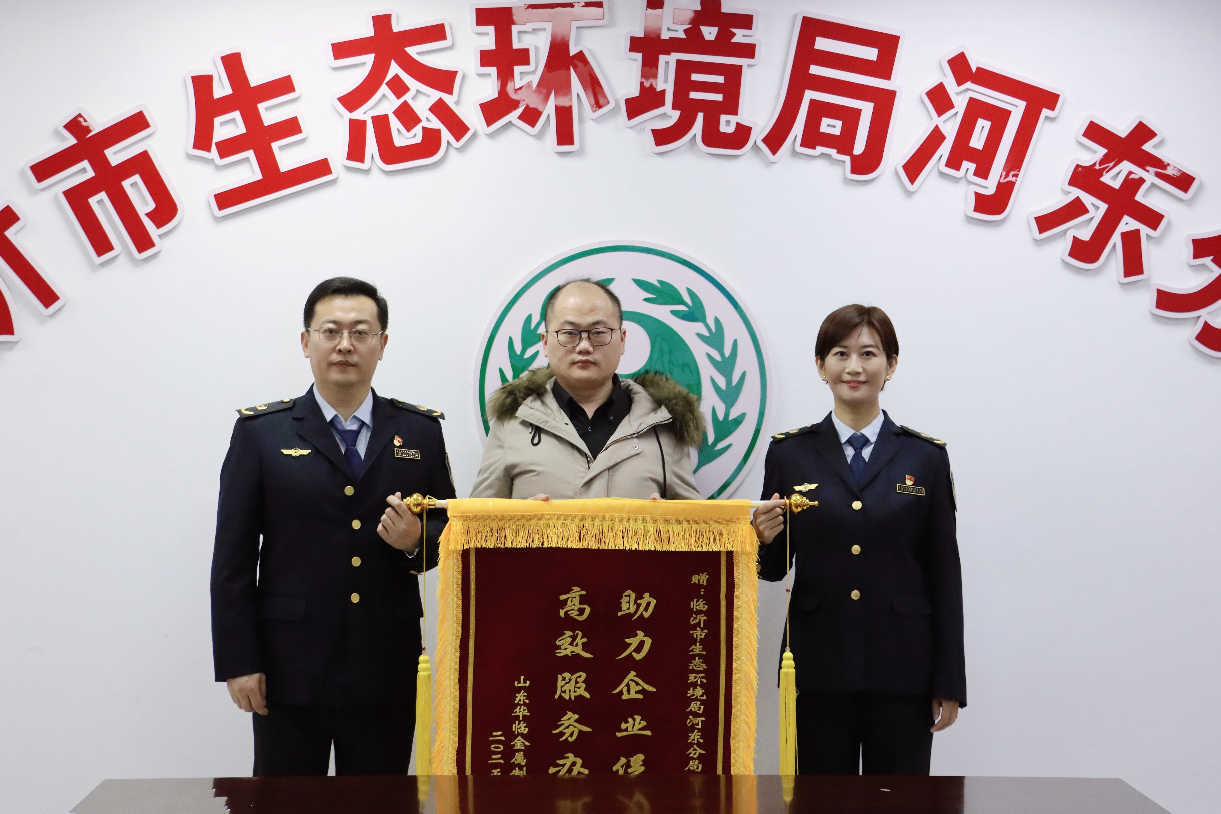 (山东华临金属制品有限公司企业经理送锦旗感谢河东分局在办理环评审批行政许可事项时,提供的高效、周到的服务。)