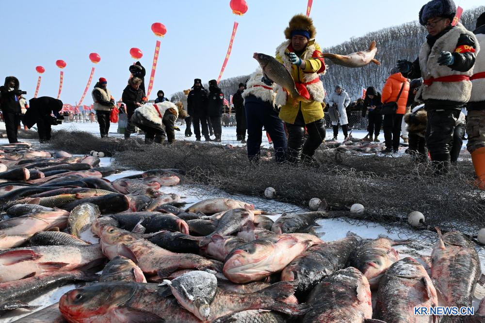 15일 징포후(鏡泊湖) 겨울 고기잡이 축제에서 사람들이 물고기를 낚아 올리고 있다.