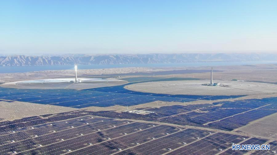 칭하이(青海)성 하이난(海南)짱(藏)족자치주 궁허(共和)현 타라탄(塔拉灘) 녹색산업단지 내 태양광 발전소를 2025년 1월 15일 드론에 담았다. (사진/신화통신)