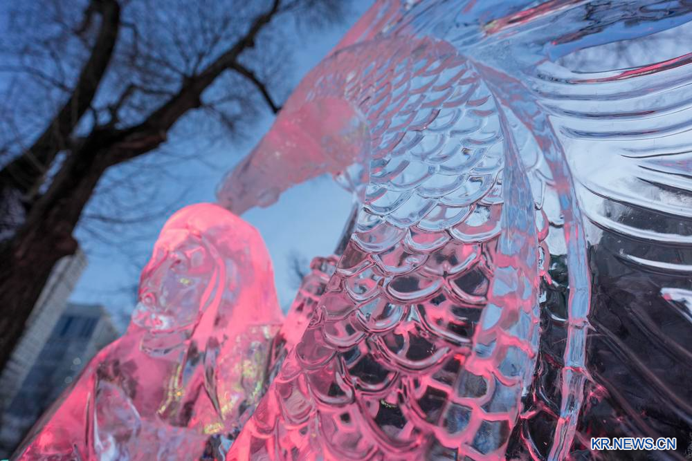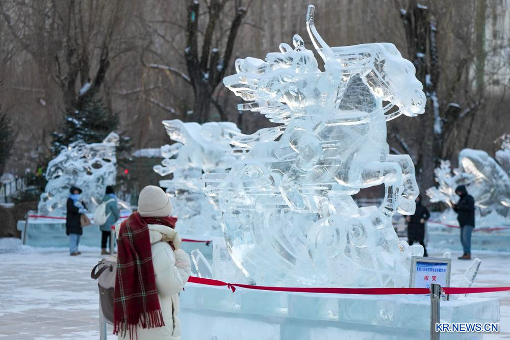 헤이룽장(黑龍江)성 하얼빈(哈爾濱)시 자오린(兆麟)공원에 전시된 얼음 조각 작품을 14일 카메라에 담았다.