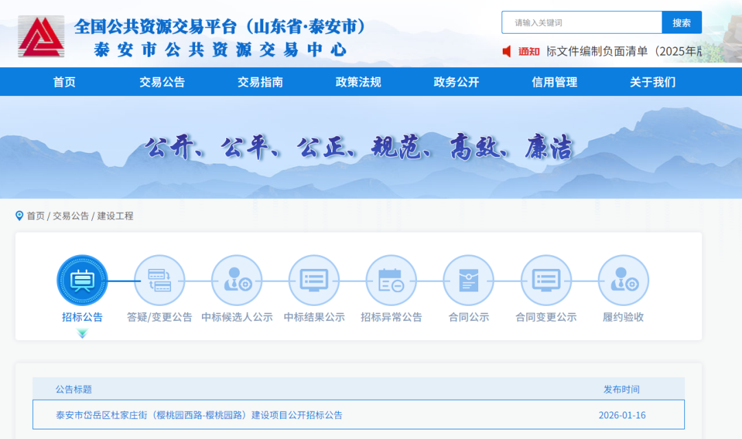 1月16日,泰安市公共资源交易中心发布泰安市岱岳区杜家庄街(樱桃园西路—樱桃园路)建设项目公开招标公告,详情如下: