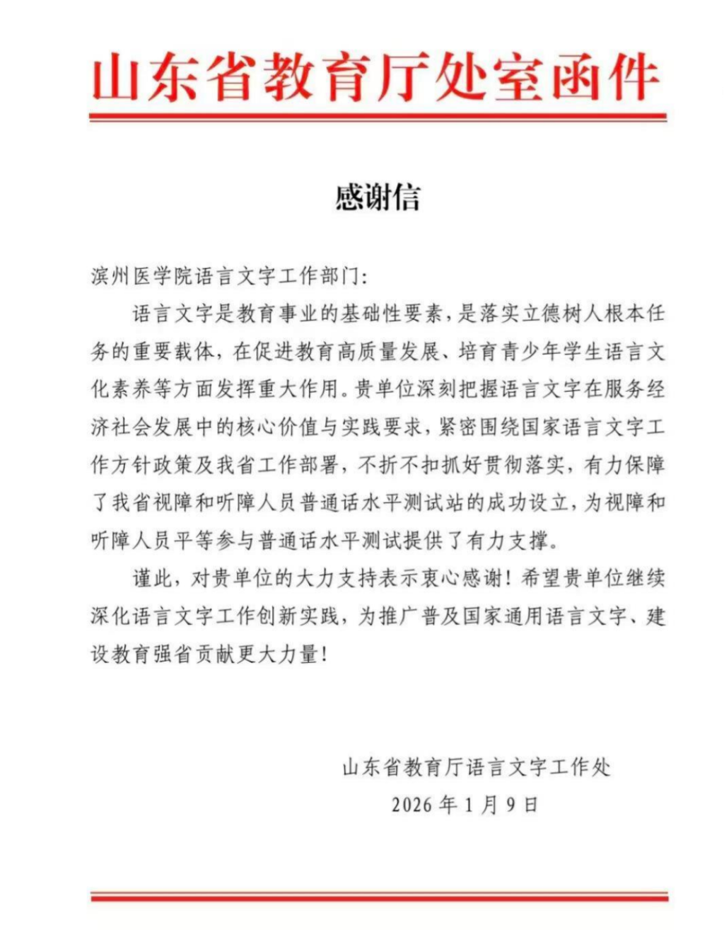 近日,滨州医学院收到山东省教育厅语言文字工作处发来的感谢信,对学校在山东省视障、听障人员普通话水平测试站建设工作中提供的大力支持与重要保障表示衷心感谢,并对学校在语言文字工作方面的实践成效与社会担当给予高度肯定。