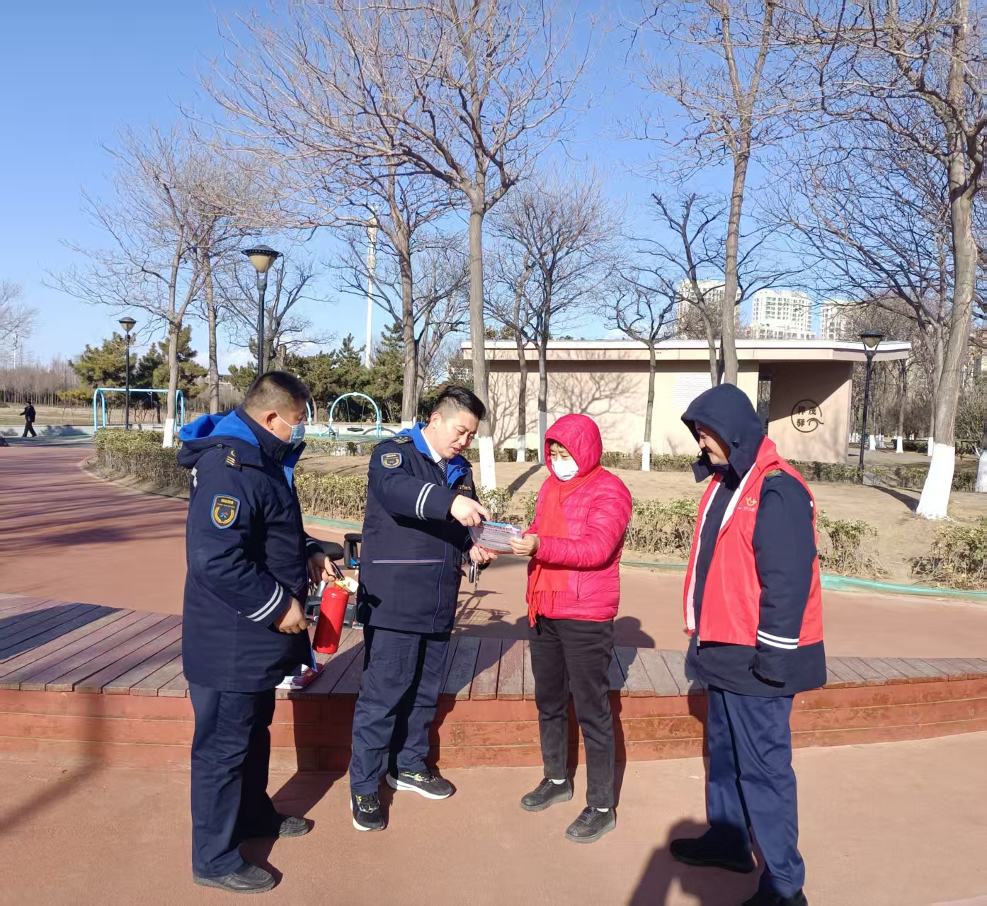 在李村公园,第七分公司“萤火之光”志愿者联合“i在您身边”工会志愿者也开展了形式多样的防火宣传活动。公园内散步休闲的市民络绎不绝,尤其是老年群体较多。志愿者们主动上前与市民交流,用接地气的“本地话”讲解冬季防火要点,针对老年群体认知特点,放慢语速、反复强调,重点普及了家庭防火、户外用火安全等知识。