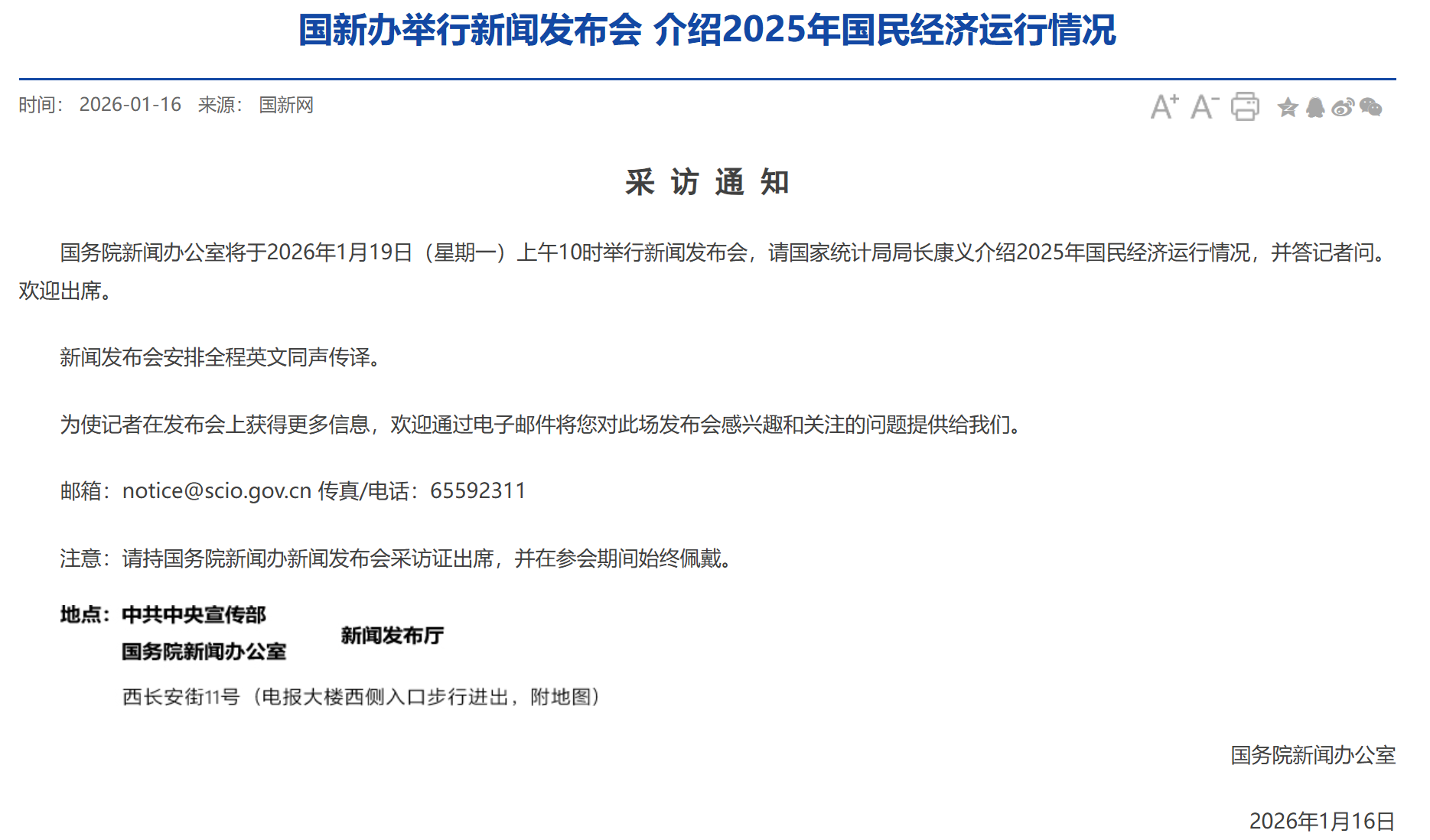 1月16日,记者从国新办官网获悉,国务院新闻办公室将于2026年1月19日(星期一)上午10时举行新闻发布会,请国家统计局局长康义介绍2025年国民经济运行情况,并答记者问。(大众新闻记者董婉婉)