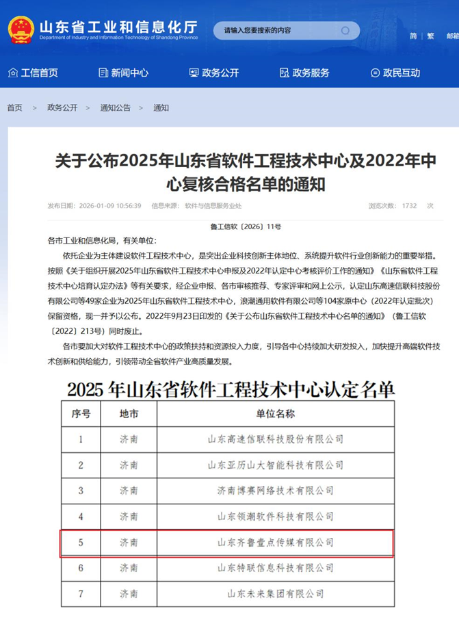 近日,山东省工业和信息化厅公布49家2025年山东省软件工程技术中心企业名单,山东数字文化集团山东齐鲁壹点传媒有限公司成功入选。