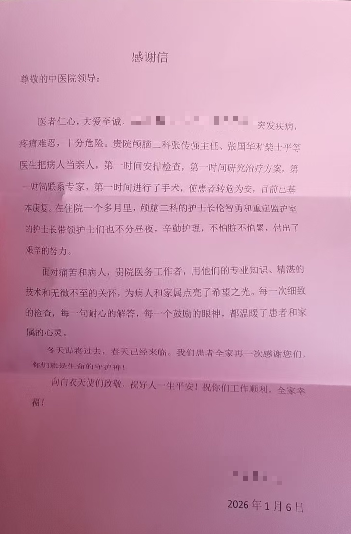 一封朴素无华却饱含深情的感谢信,悄然出现在日照市中医医院颅脑外科的医护办公室内。它没有华丽的辞藻堆砌,却字字句句凝聚着一个家庭在绝望边缘重获新生的无尽感激。这封信,被郑重地交到了科室医护人员的手中,成为了对他们辛勤付出与精湛医术的最高赞誉。