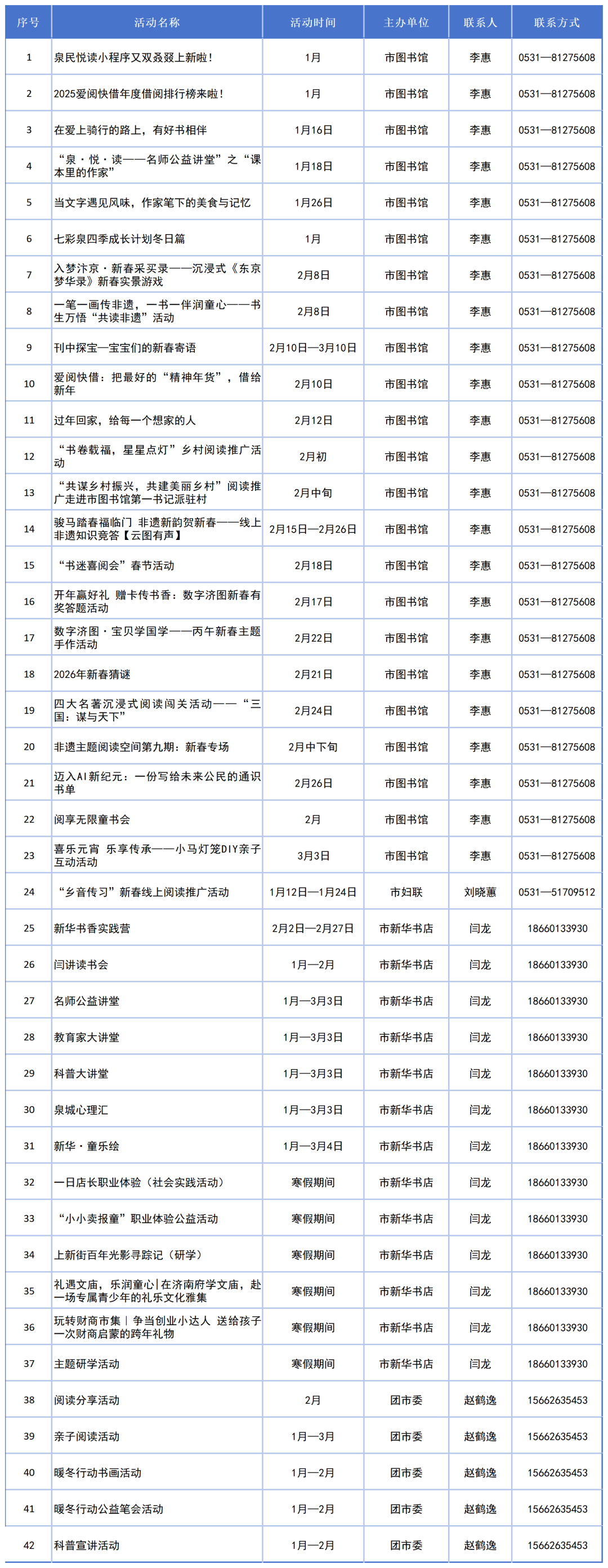 为便利广大市民便捷参与、尽享阅读之美,特此汇总发布2026年“喜阅新春”全民阅读系列活动清单。诚邀全体市民共赴书香之约,让阅读融入城市血脉、成为济南最动人的精神底色!