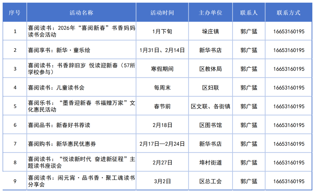《全民阅读促进条例》即将正式实施,为深入推动全民阅读在泉城落地生根、浸润城乡肌理,持续丰富市民精神文化生活,厚植“爱读书、读好书、善读书”的城市文化氛围,济南市委宣传部联合市直部门及各区县(功能区),精心策划推出2026年“喜阅新春”全民阅读系列活动,以书香为媒点亮冬日光景,以文润心添彩新春佳节。