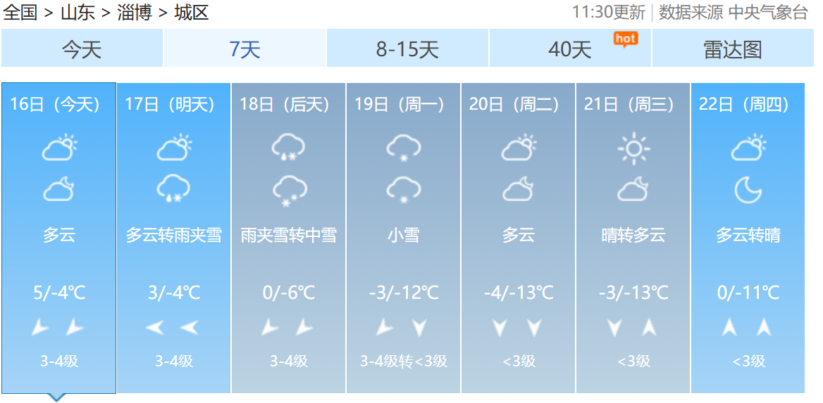 17日白天多云转阴,夜间北部地区有小雪,中南部地区有雨夹雪;18日白天有雨夹雪转中雪,夜间有大雪或暴雪,鲁中山区局部可能有冻雨;19日中北部地区小雪转多云,南部山区有小雪局部中雪。