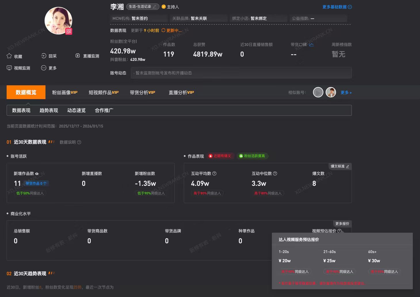 1月16日,媒体报道李湘全平台账号被禁止关注引发热议。数据显示,李湘在抖音有421万粉丝,在微博上有2456.2万粉丝,在小红书上有48.7万粉丝。截至1月16日11时,李湘视频平台粉丝数为421万,近30日掉粉1.46万。商业化水平显示,其1-20s、21-60s、60s以上视频广告报价分别为20万元、25万元、30万元。