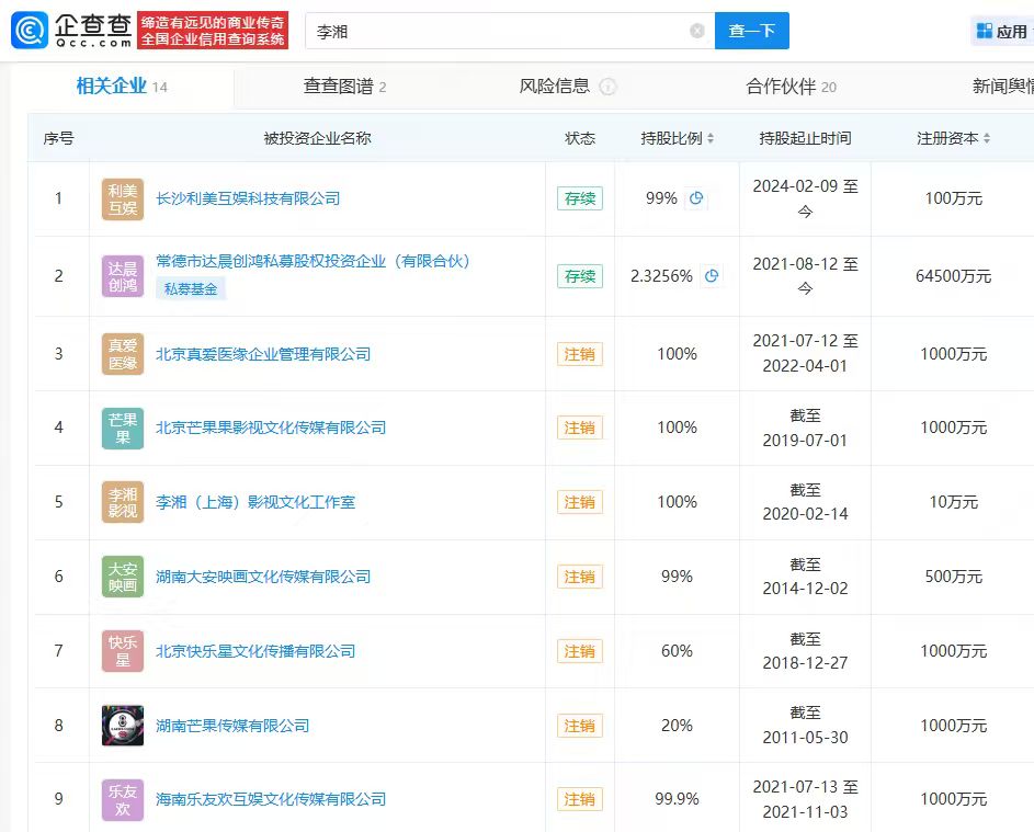 近日,有媒体发现,李湘多平台账号被禁止关注。企查查APP显示,当前李湘对外投资有长沙利美互娱科技有限公司、常德市达晨创鸿私募股权投资企业(有限合伙)等公司,其中北京真爱医缘企业管理有限公司、北京芒果果影视文化传媒有限公司、李湘(上海)影视文化工作室等多家已注销。2025年8月,李湘与王岳伦合资成立湖南尽开颜影视传媒有限公司,由李湘持股99%、王岳伦持股1%并担任法定代表人职务。