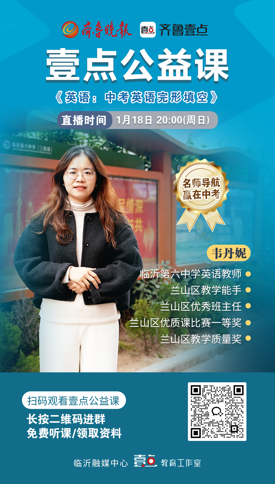 为助力学生有效攻克这一难点,齐鲁晚报临沂融媒中心壹点教育工作室今年全新推出“名师导航,赢在中考”壹点公益课。1月18日(周日)20:00,临沂第六中学英语教师韦丹妮将走进直播间,带来专题课程:《中考英语完形填空解题指导》,帮助学生理清思路、掌握策略、提升解题效率。