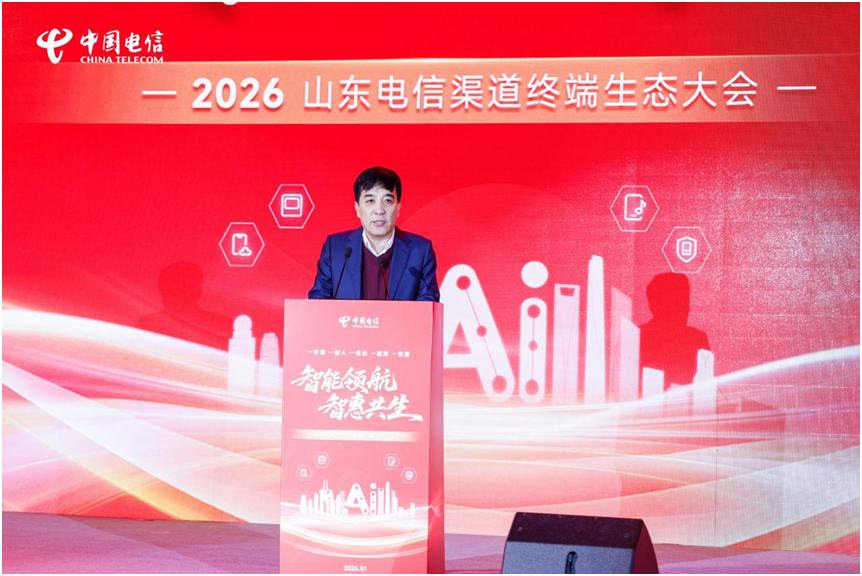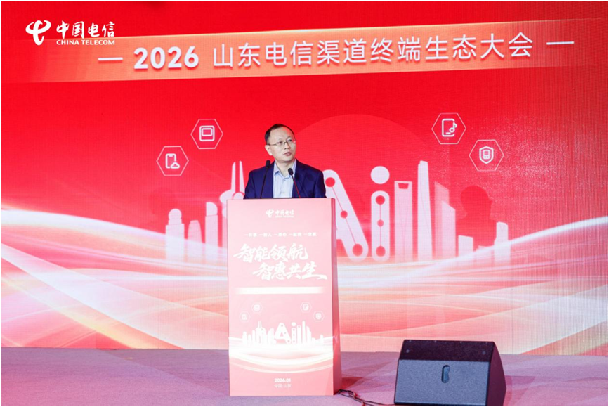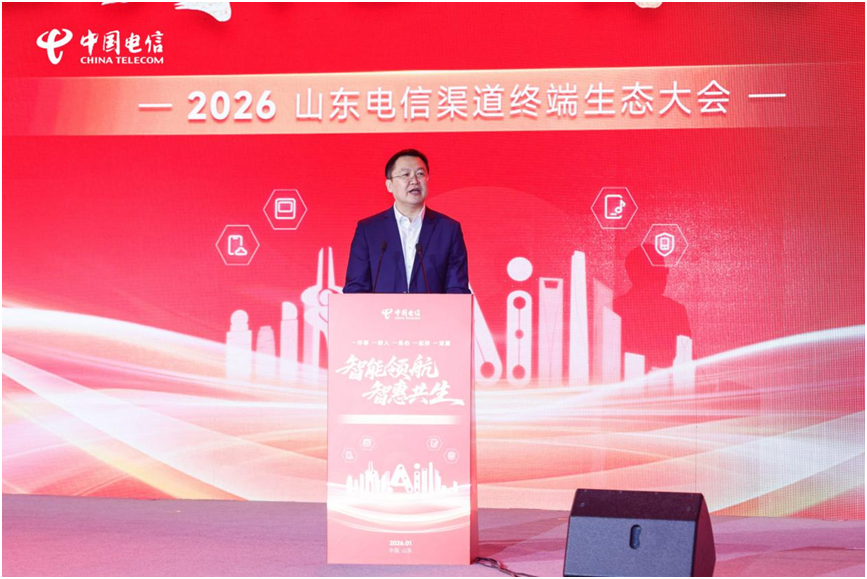 1月16日,以“智能领航,智惠共生”为主题的2026中国电信山东公司(以下简称“山东电信”)渠道终端生态大会在济南成功举办。本次大会上,山东电信与集团各专业公司、线上线下渠道合作伙伴及终端厂家代表等300余位嘉宾齐聚一堂,立足数字化转型浪潮,聚焦渠道赋能和生态共建,齐心擘画新一年山东通信行业渠道终端生态高质量发展的新蓝图。中国电信集团公司全渠道运营中心党委副书记、副总经理徐岩和天翼电信终端公司副总经理桂烜到会做了专题致辞,对大会的成功举办表示了祝贺,并对山东电信渠道终端生态运营给予充分肯定,提出殷切的期望。