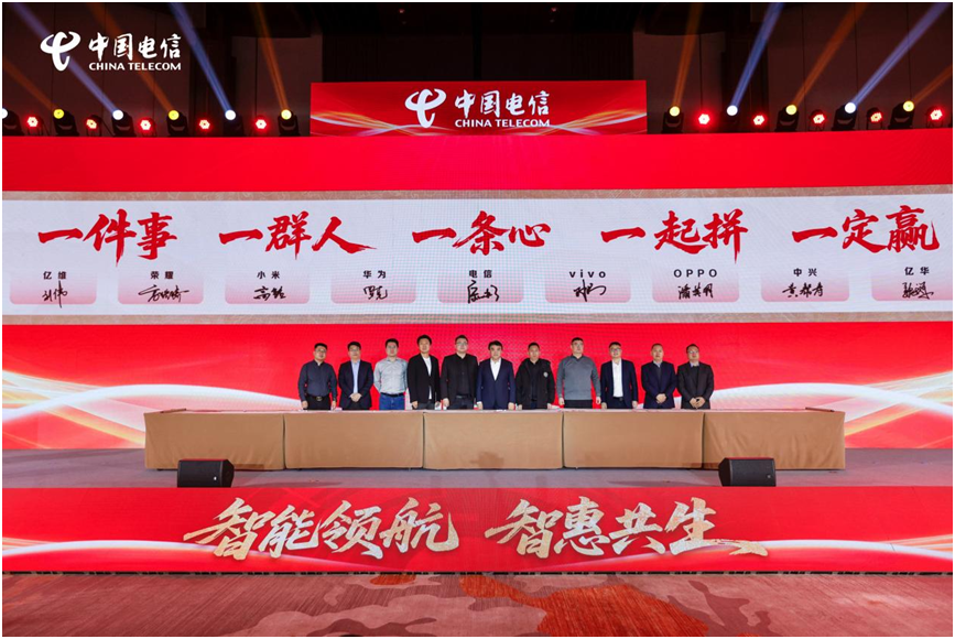 本次大会上,山东电信与荣耀、小米、华为、vivo、OPPO、中兴等终端厂商,以及新蓝图、亿维、亿华、中岩等省内强商共同举办“2026渠道终端生态合作战略签约”仪式,标志着山东电信领衔的渠道终端生态联盟合作更加紧密,合作基础更加稳固。同时,大会上多项AI创新成果与发展规划精彩亮相,重点呈现了引领AI潮流的天翼智屏、天翼智铃等“四智产品”,以及中国电信具有前瞻性的“AI+智能体”、“AI+具身智能”、“AI+端侧智能”、“AI+综合治理”等战新产品和平台化业务。现场的小米、vivo、中兴、荣耀、OPPO 等知名手机品牌也在现场展示了最新的5G终端,全方位沉浸式展现中国电信领衔的渠道终端生态联盟在全渠道终端领域的创新成果。