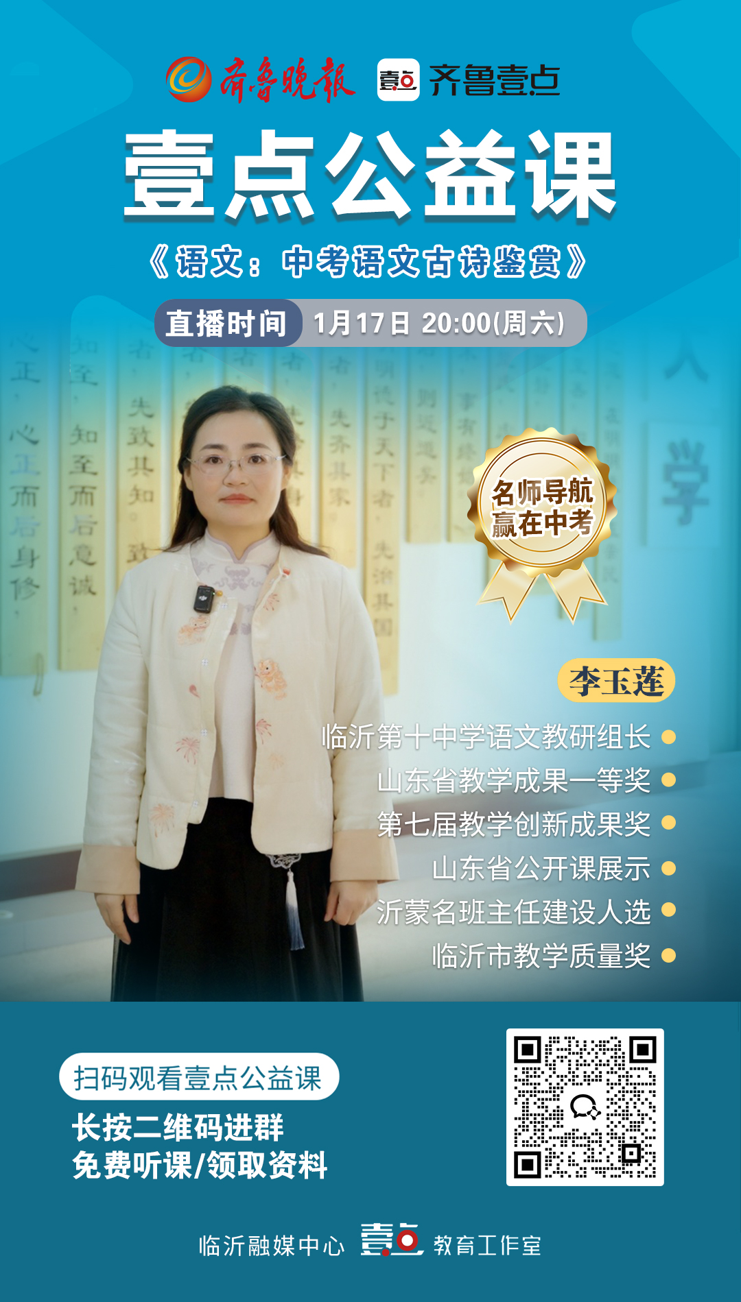 为助力学子系统攻克这一专题,齐鲁晚报临沂融媒中心壹点教育工作室今年全新推出“名师导航,赢在中考”壹点公益课。1月17日(周六)20:00,临沂第十中学语文教师李玉莲将带来专题指导:《中考语文古诗鉴赏复习——如何准确把握情感》,帮助同学们梳理方法、深化理解、提升应试能力。
