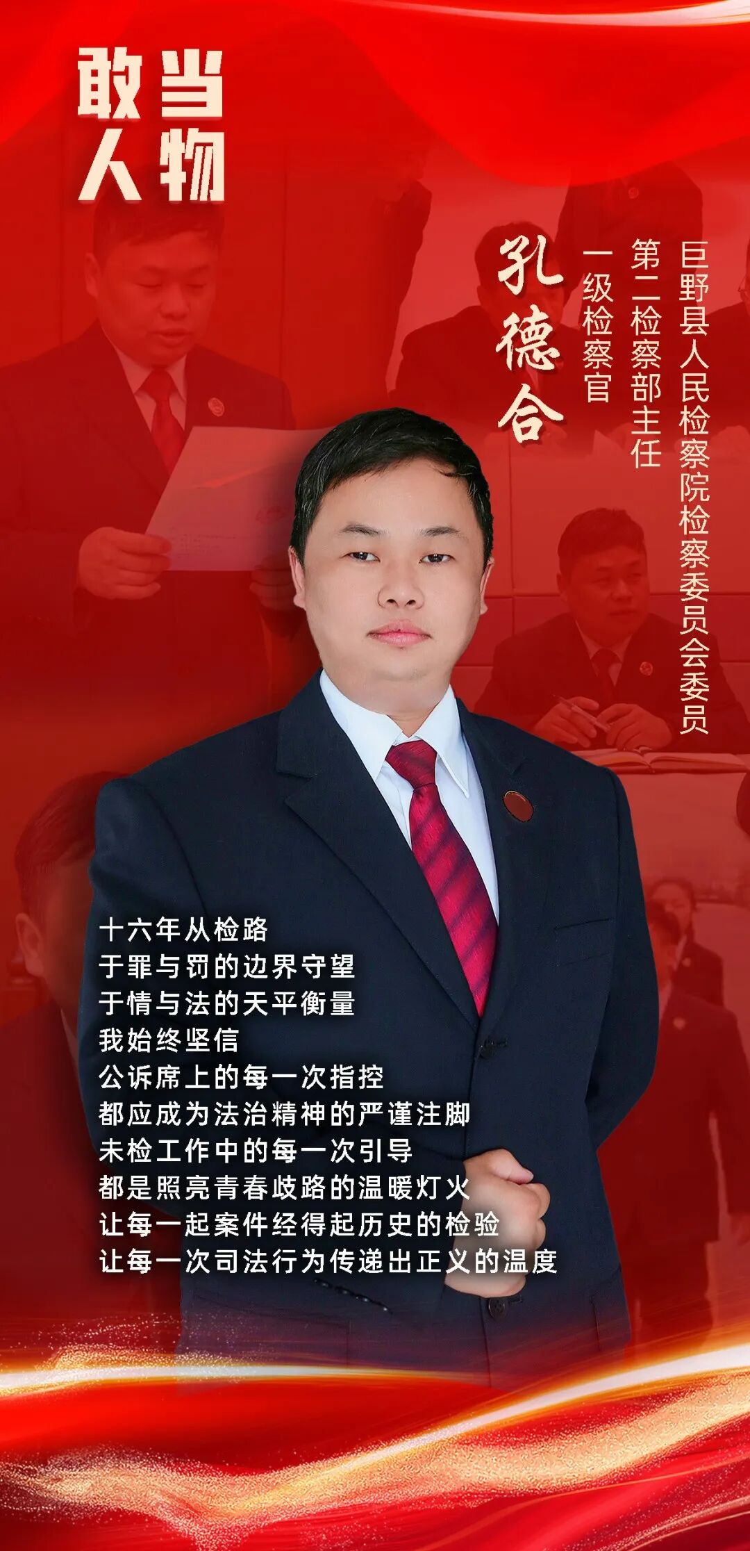 他的办公室灯光常亮至深夜,案头卷宗堆积如山;他在公诉席上言辞犀利、法理分明;他在面对青少年嫌疑人时,眼神中又会流露出深切的关怀。他就是巨野县人民检察院检察委员会委员、第二检察部主任、一级检察官孔德合。