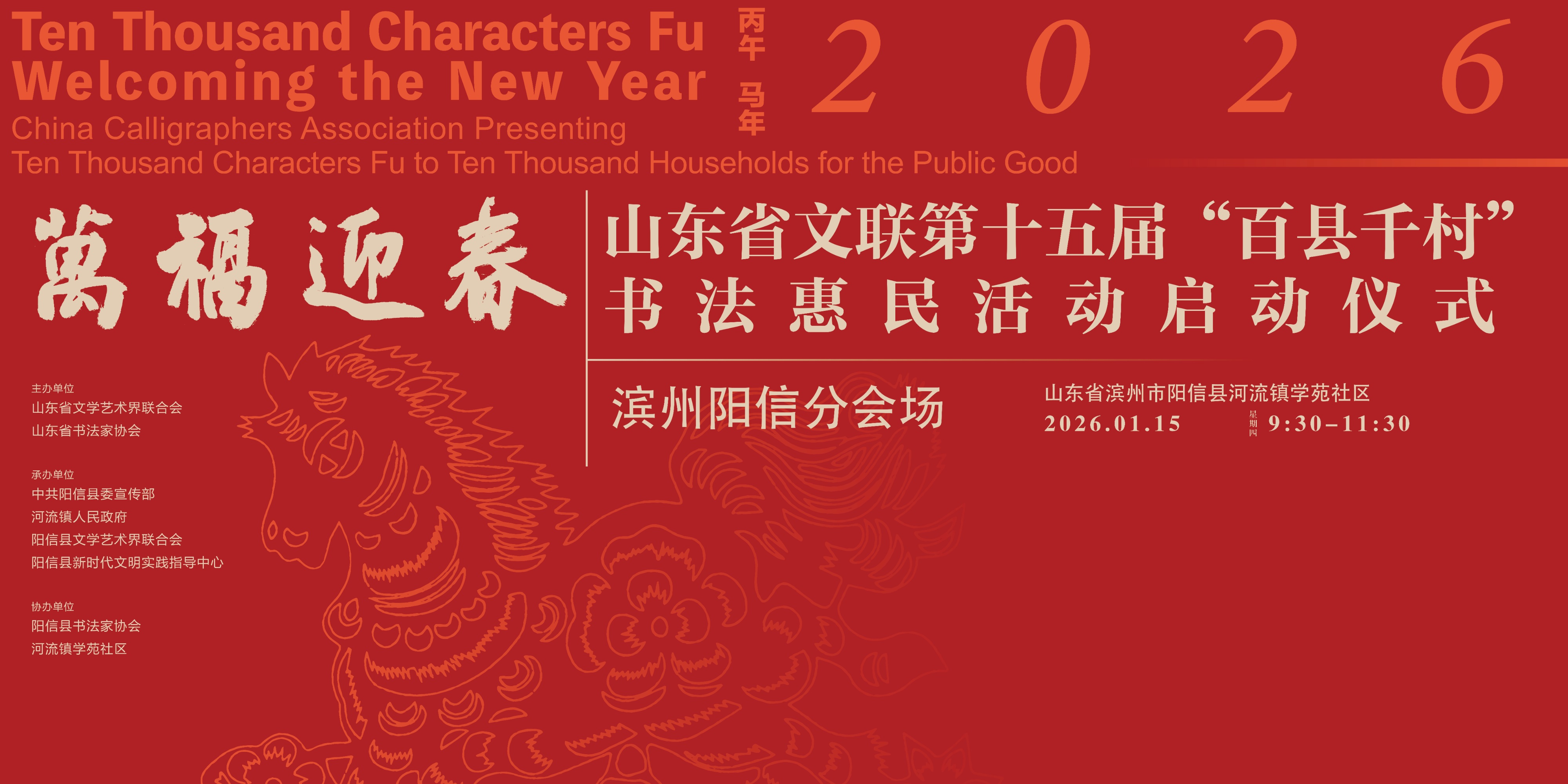 本次活动由山东省文学艺术界联合会、山东省书法家协会主办,中共阳信县委宣传部、河流镇人民政府、阳信县文学艺术界联合会、阳信县新时代文明实践指导中心承办,阳信县书法家协会、河流镇学苑社区协办。活动以文化惠民为宗旨,为当地群众送上新春祝福,正式拉开全县新春系列文化活动的序幕。