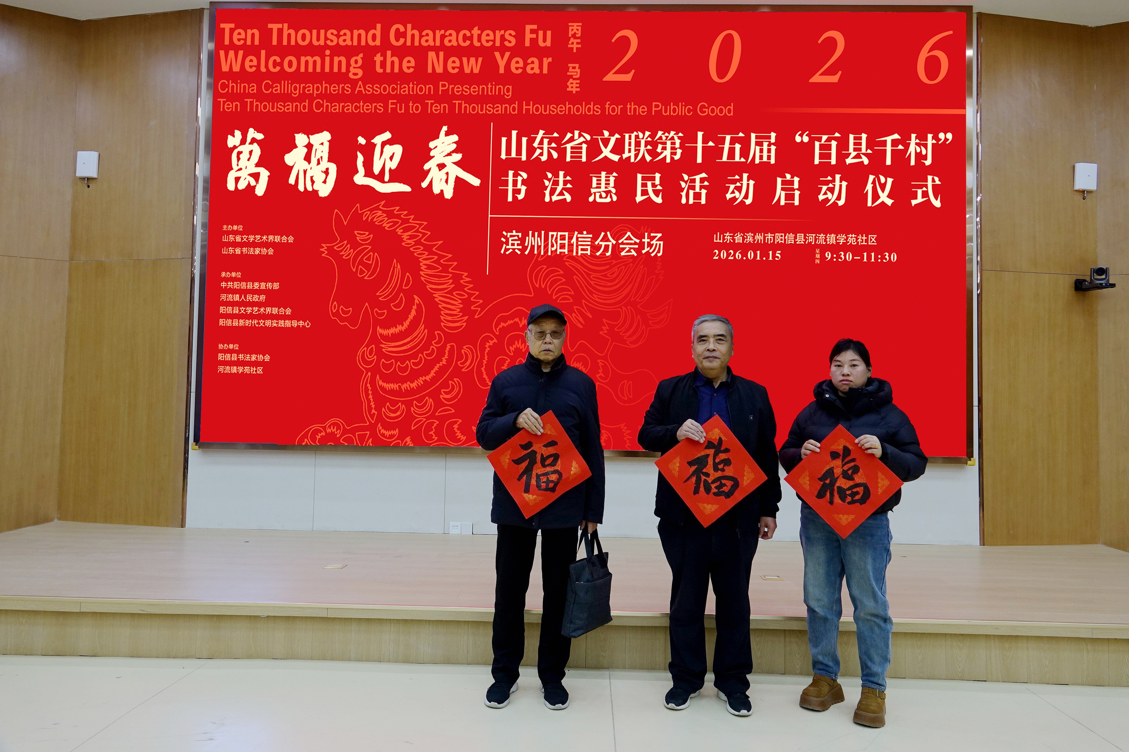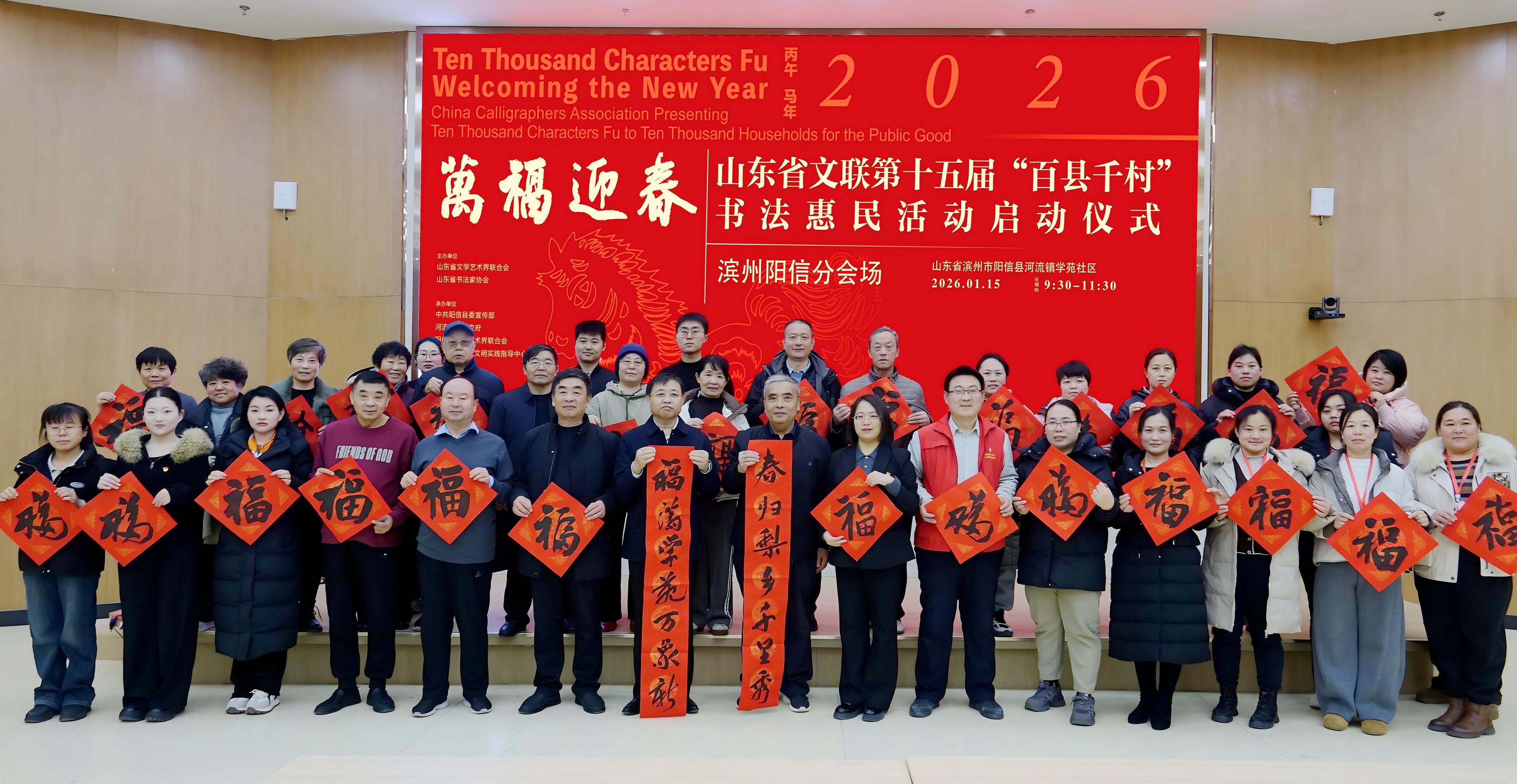 2026年1月15日,万福迎春——山东省文联第十五届“百县千村”书法惠民活动(滨州阳信分会场)启动仪式在阳信县河流镇学苑社区举行。阳信县文联主席祝广信及县书法家协会骨干会员参加活动。