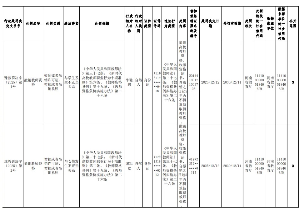日前,河南省教育厅正式发布《2025年撤销高校教师资格行政处罚》的通报,依法对省内五名高校教师作出撤销教师资格的处理。
