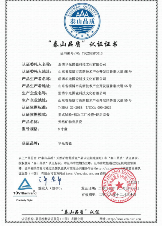 近日,淄博华光国瓷科技文化有限公司成功通过“泰山品质”认证,荣获由莱茵检测认证服务(中国)有限公司颁发的认证证书(编号:TSQ2025P0013),成为淄博市2025年度唯一获此殊荣的陶瓷企业。这一认证不仅彰显了华光国瓷在产品质量、技术创新方面的卓越表现,更凸显了其在淄博陶瓷产业中的领军地位。