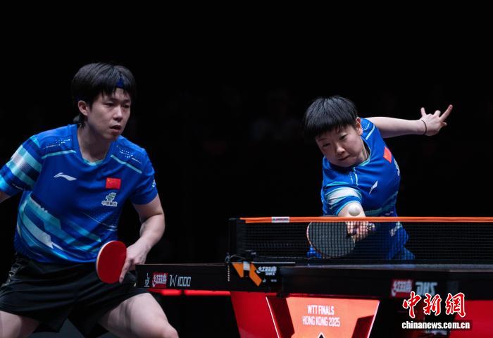 2025年12月13日,世界乒乓球职业大联盟(WTT)香港总决赛混双决赛在香港体育馆举行。图为孙颖莎(右)和王楚钦在比赛中回球。中新社记者 侯宇 摄
