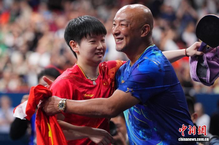 当地时间2024年7月30日,在巴黎奥运会乒乓球混合双打决赛夺冠后,孙颖莎(左)和教练员肖战相拥。中新社记者 赵文宇 摄