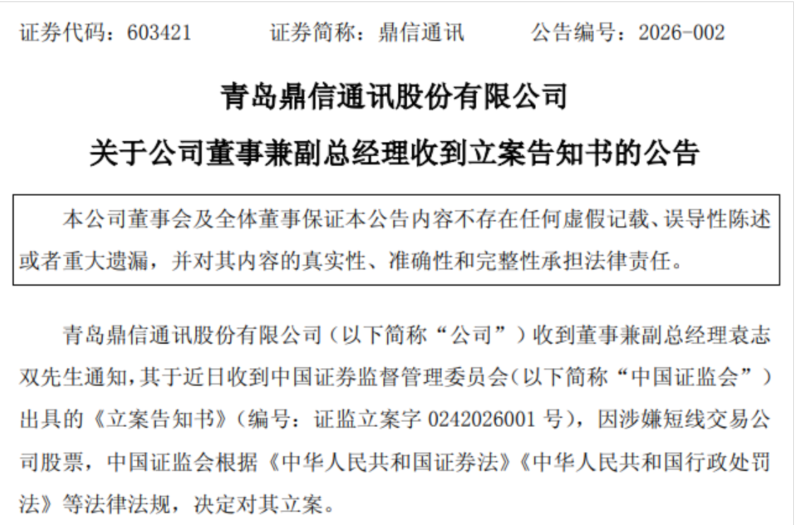 1月17日,鼎信通讯(603421.SH)发布公告称,公司收到董事兼副总经理袁志双通知,其于近日收到中国证监会出具的《立案告知书》,因涉嫌短线交易公司股票,中国证监会决定对其立案。