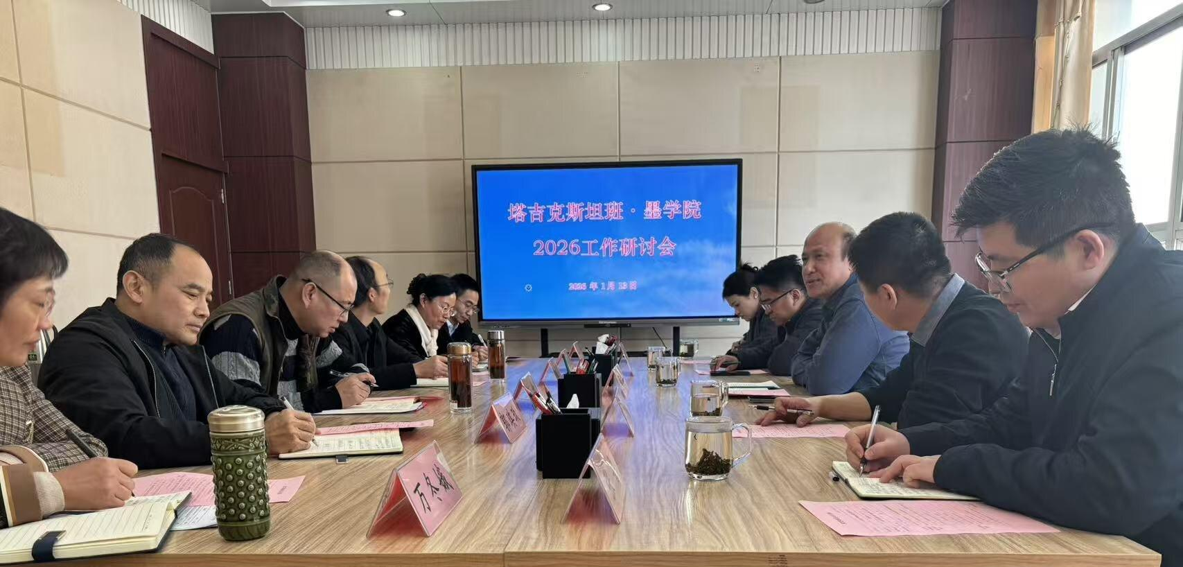 1月13日下午,山东省产教融合综合服务平台一行五人到枣庄职业学院考察交流,并召开塔吉克斯坦“班·墨学院”2026年工作研讨会。枣庄职业学院党委委员、副院长王念,党委委员、副院长刘希震出席会议,墨子国际学院及相关系(院)负责人参加会议。