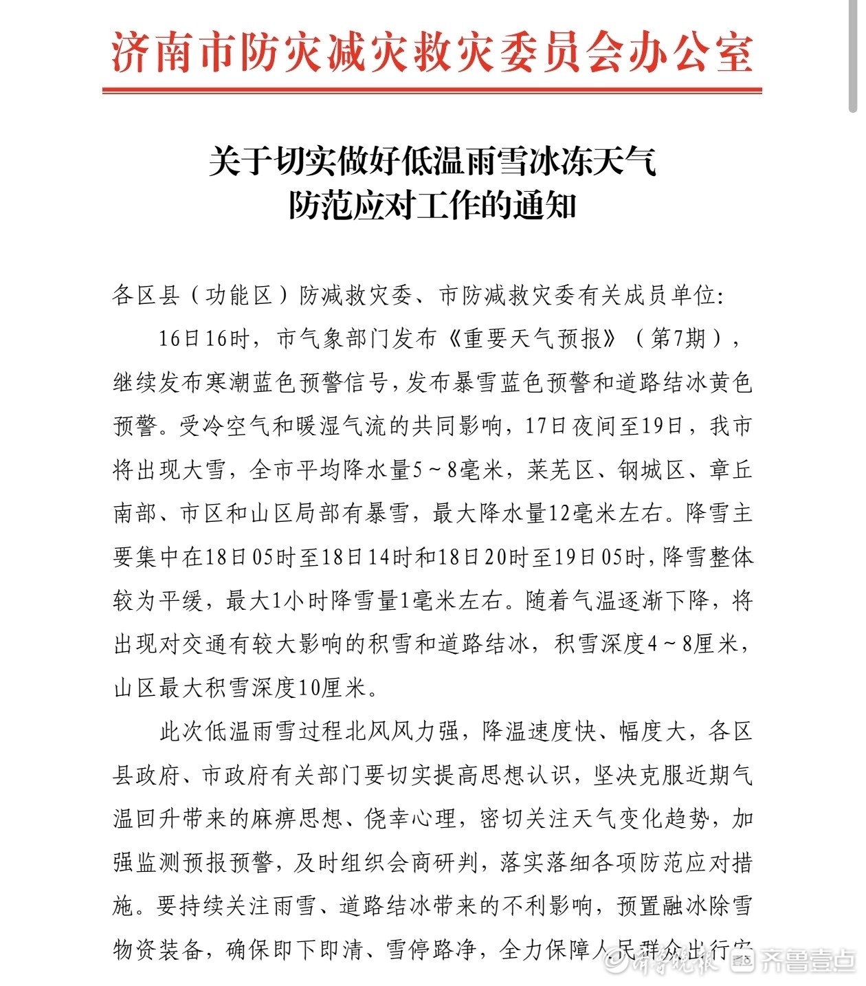 寒潮来袭!济南市防灾减灾救灾委员会办公室发布防范通知