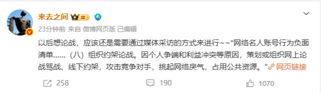 16日晚,新浪微博CEO王高飞通过个人微博@来去之间发布最新消息:以后想论战,应该还是需要通过媒体采访的方式来进行。具体如下:大众新闻·齐鲁壹点记者袁野