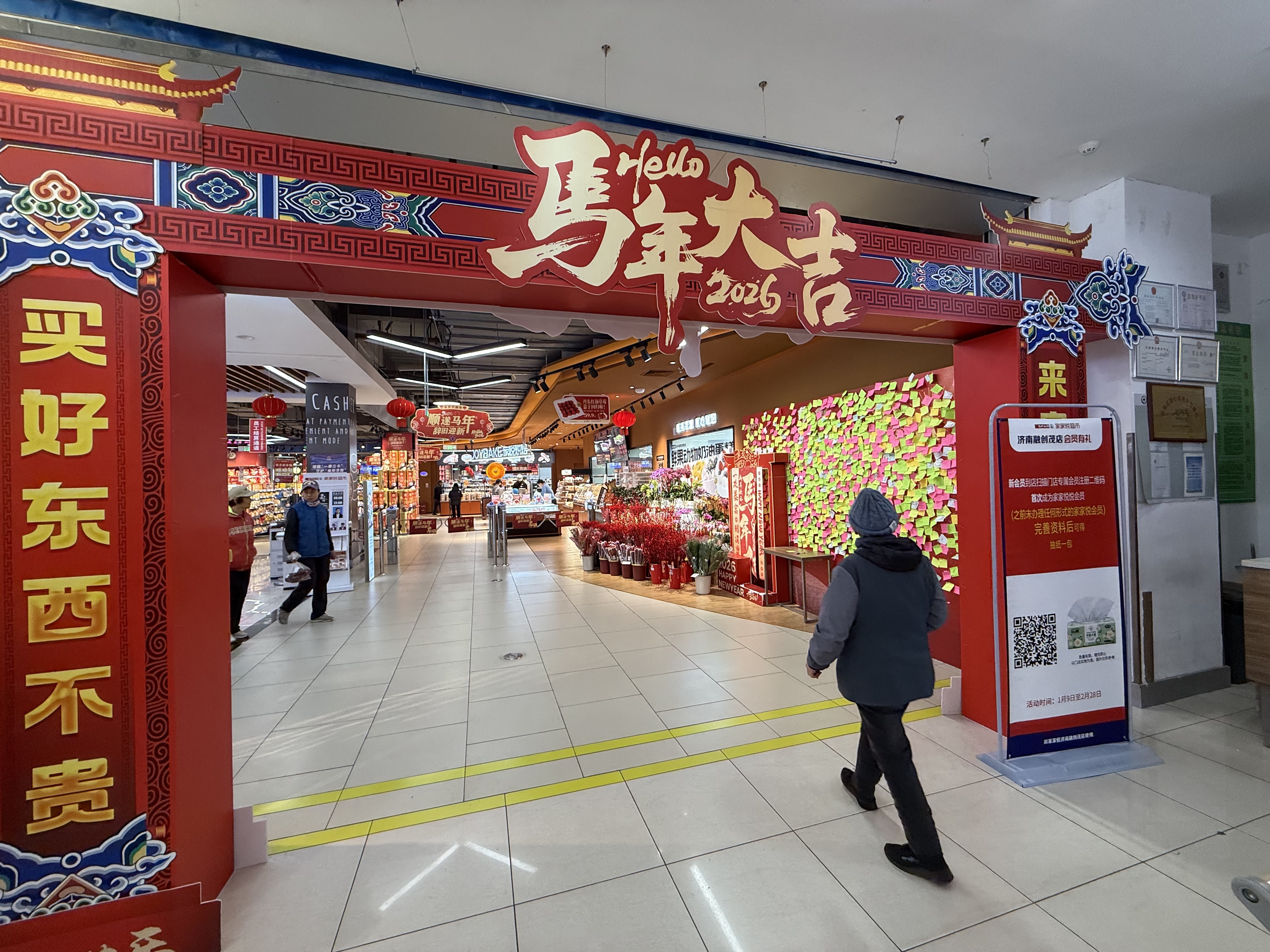 一进门,消费者的眼球便能被满场的喜庆氛围吸引,一整面墙贴满了五颜六色的便利贴,上面写满新年愿望,彰显着大家对新一年最真挚的期盼,极大地提高了购物的情绪价值。鲜花专区的一抹亮色更添生机。记者了解到,如今鲜花已成为新春送礼的新选择,银柳、腊梅这两款应季花材存活时间长、养护便捷,更以喜庆的姿态承载着新春祝福,所以格外抢手,为年货清单增添了几分雅致格调。家家悦精准捕捉这一趋势,将鲜花纳入新春送礼品类,与各类年货相映成趣。