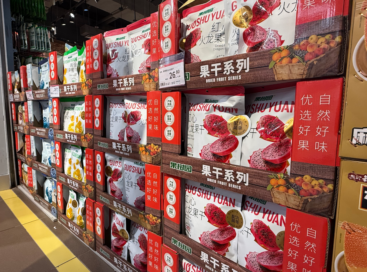 精准踩中当下健康消费的主流趋势,家家悦全新上架的高纤维的火龙果、菠萝蜜、蓝莓等果干新品,妥妥戳中了注重饮食健康的年轻消费者群体的心。记者查看了其中一款“火龙果果干”的配料表,仅有“火龙果”,未添加任何冗余成分。既能满足味蕾的愉悦享受,又能轻松补充膳食纤维。走到糖果区,扑面而来的都是浓浓的新春仪式感,没有盲目堆砌新奇口味,用精致的陈列勾起了消费者对于新年的回忆——“过年吃糖,甜甜蜜蜜”。