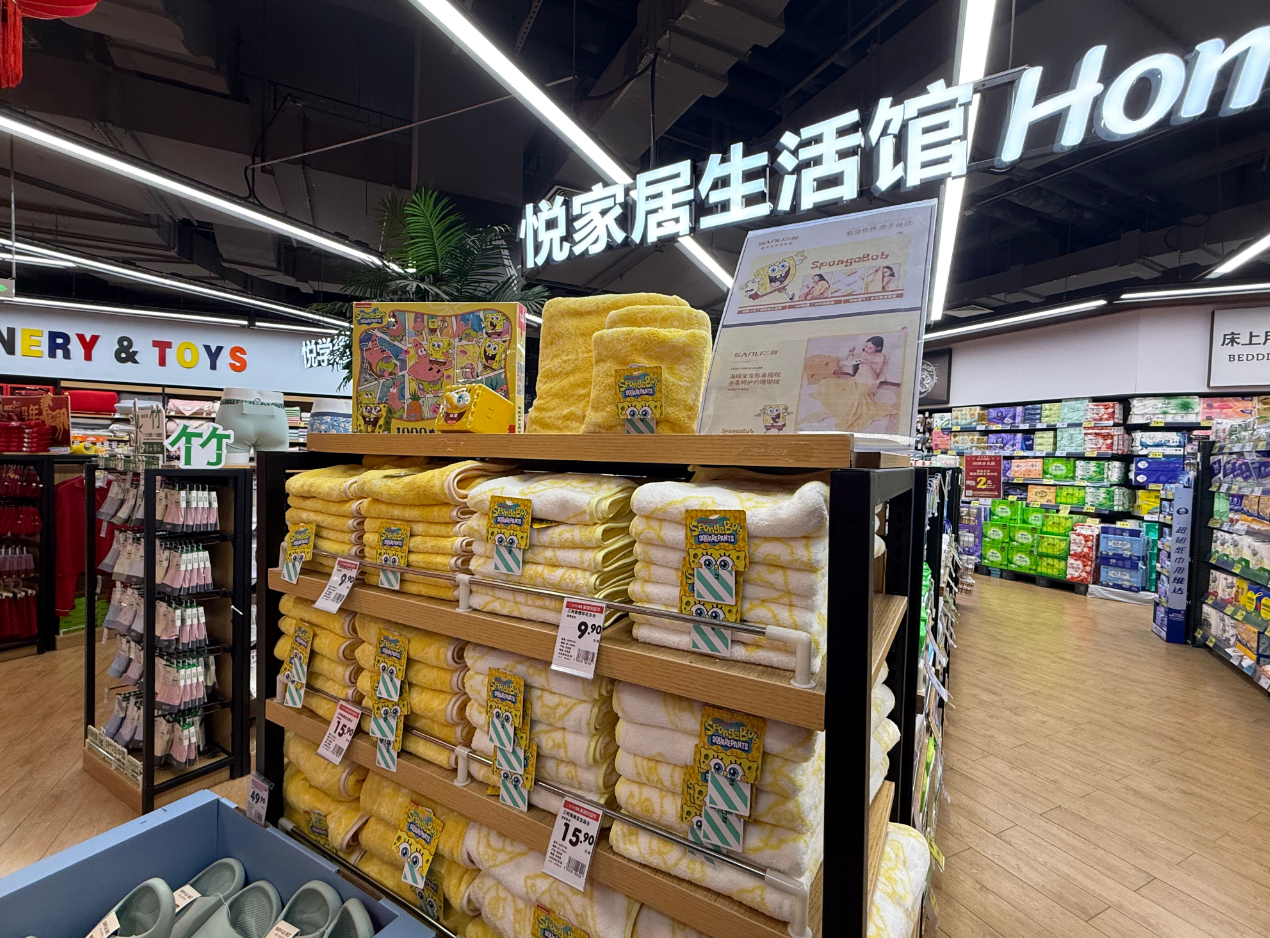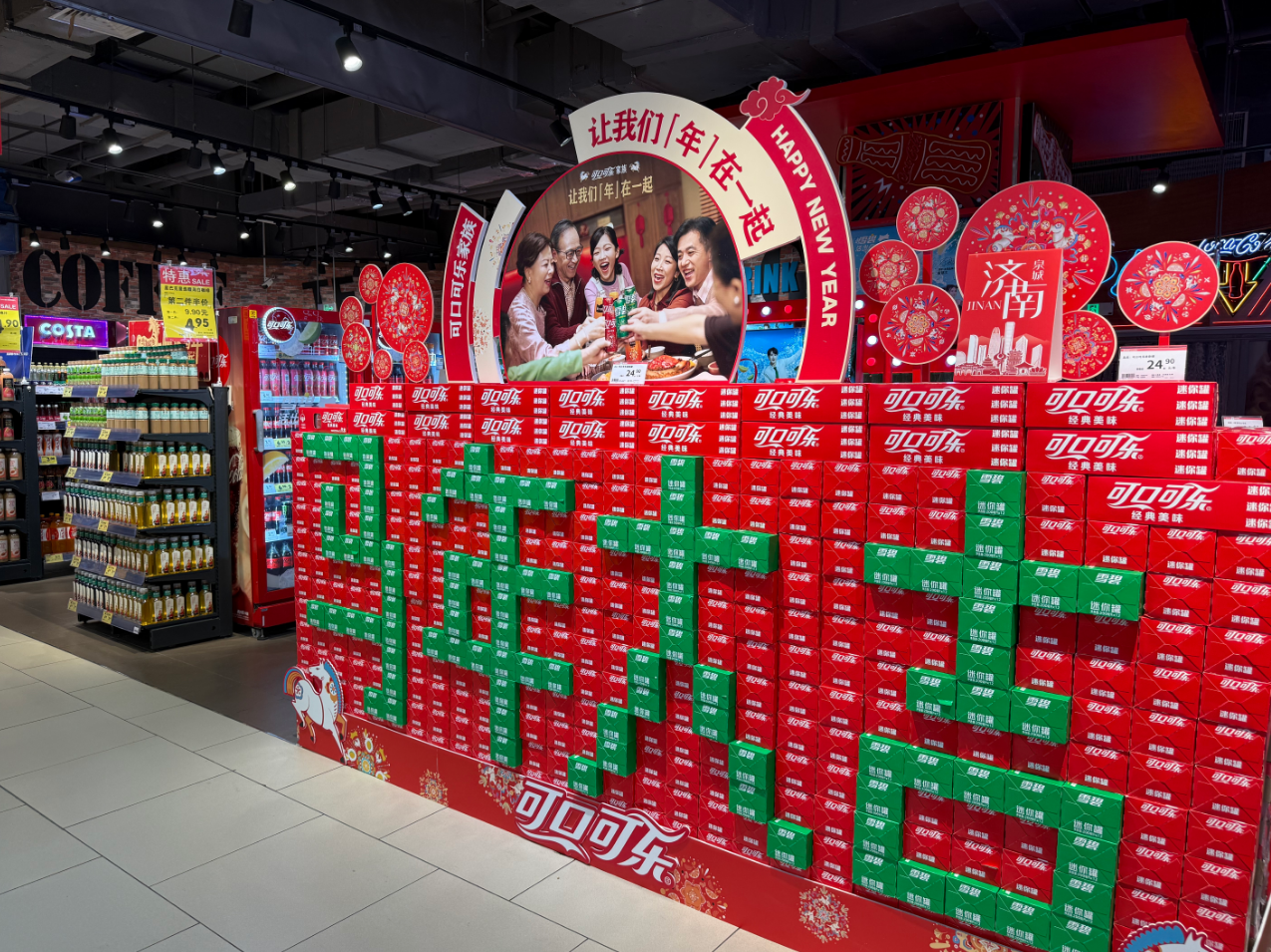 捕捉市场潮流趋势,家家悦抢先布局春节档电影热点,上线了多款海绵宝宝元素周边,货架上满是萌趣的海绵宝宝元素好物,果冻等零食印着熟悉的卡通形象,还有软乎乎的毛巾、小巧的玩具,种类齐全,孩子们一眼就被吸引住。饮品区更是令人眼前一亮,工作人员用各色饮料精心拼搭出“马年大吉”的字样,色彩鲜亮、创意十足,氛围感直接拉满,路过的消费者都忍不住拿出手机拍几张照片。酒水区融入了济南本土元素,自制啤酒风味独特又有记忆点,不管是自己小酌还是亲友欢聚时分享,话题感十足,为新春增添了别样滋味。
