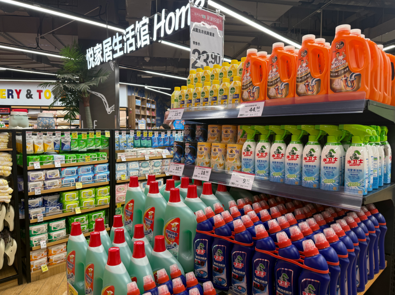 在洗护区,家家悦的主题化陈列格外让人省心,每一处布局都透着对消费者的贴心考量。洗护发品类被规整归置,洗发水旁整齐码放着同系列发膜、护发精油,不管是日常护理还是深层滋养,一站式就能配齐,不用再跨区域寻找;口腔护理区也划分得清晰明了,漱口水、牙膏、牙线按功能有序陈列,从基础清洁到进阶护理一应俱全。针对节前大扫除的需求,家家悦还专门划分了专属区域,洗衣剂、柔顺剂等衣物洗护用品集中摆放,厨房去油剂、清洁海绵等大扫除必备好物也单独归置,分类清晰、标识醒目。节前采购本就繁杂,这样的陈列设计能让消费者在忙碌中快速锁定所需商品,既省时又省力。