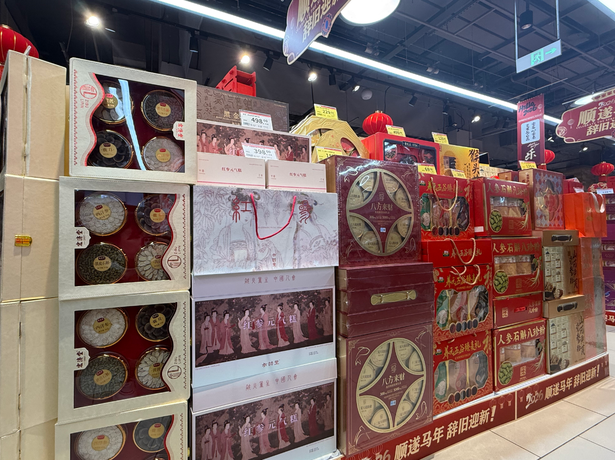 补品礼盒专区更是诚意满满,汇聚多款高品质滋补好物,成为走亲访友送健康的优选。记者看到,海参礼盒精选优质海域溯源海参,搭配高端大气的礼盒包装,内里独立分装设计兼顾保鲜与取用便捷,尽显送礼格调;菌菇礼盒严选珍品,无论是煲汤还是入菜都能解锁本真美味,是养生家庭的心头好;燕窝礼盒均为纯净原料,将滋养心意与仪式感拉满。最受大众喜爱的坚果礼盒则采用科学混合搭配,涵盖巴旦木、腰果、核桃等优质品类,新鲜酥脆、无额外添加,礼盒设计得十分喜庆亮眼,轻松适配各类送礼场景,用健康美味传递新春祝福。